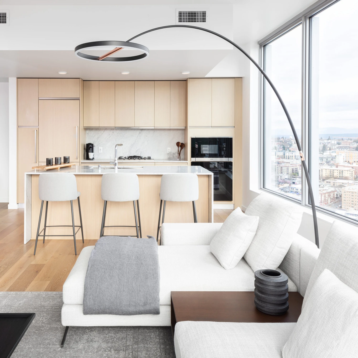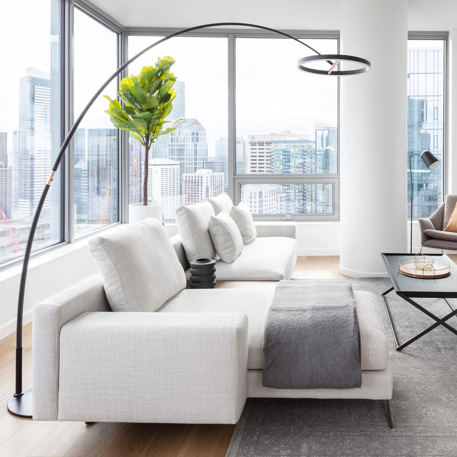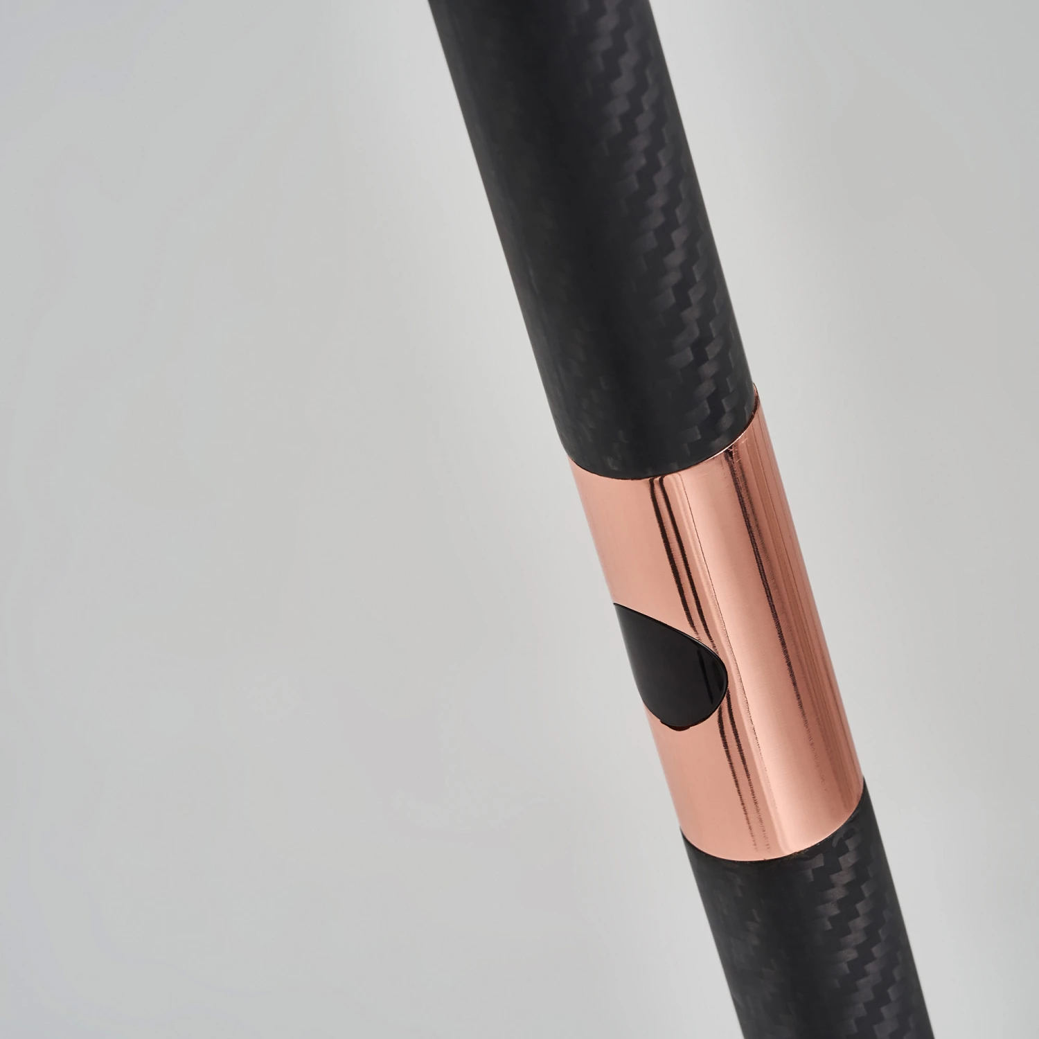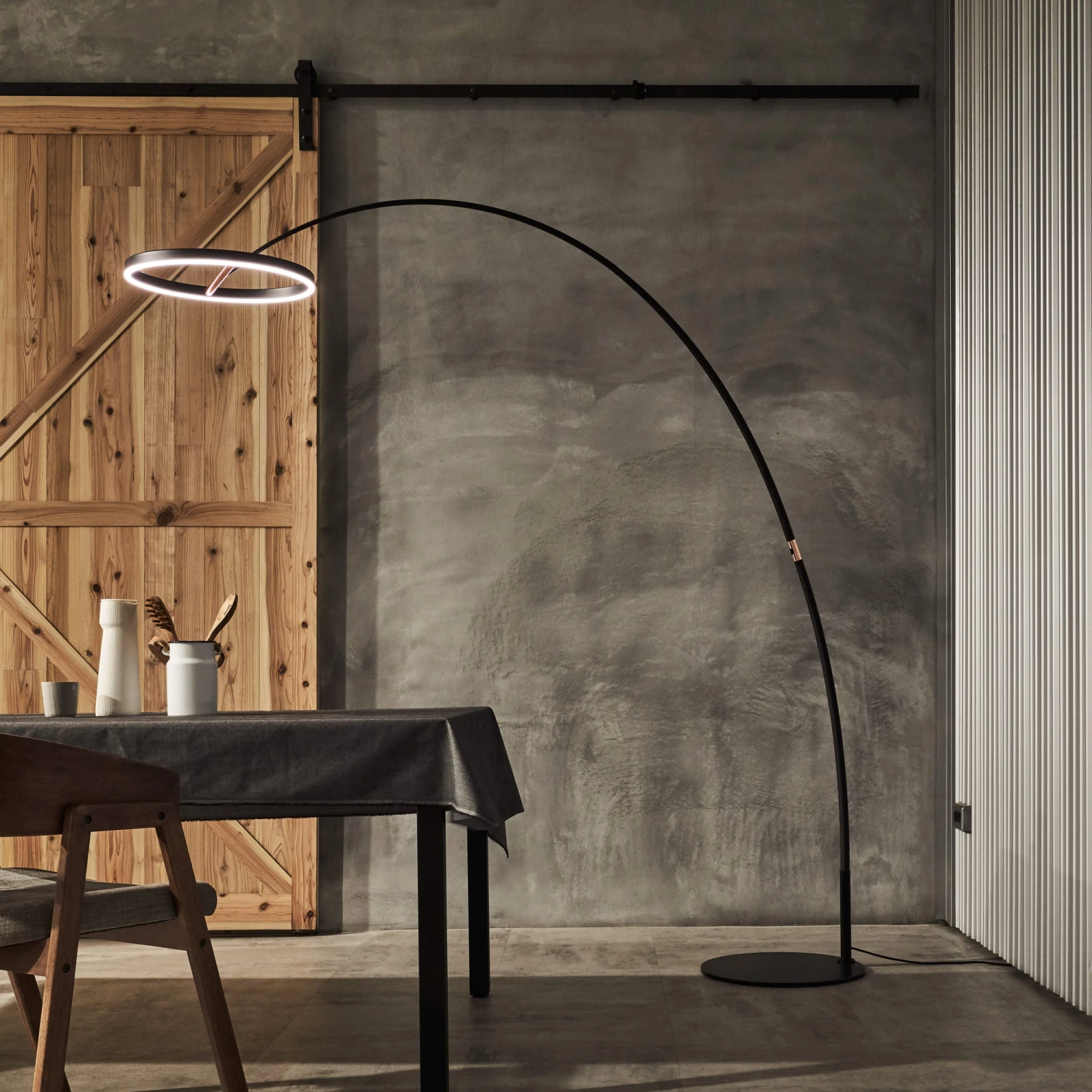The SOL Mega Floor Lamp has a low-key design with elaborate consideration. The ring like shade is finely affixed to a metallic luster balance bar, demonstrating the definition of understated luxury. The adjustable ring tilt allows the pendant to function almost like a planet floating around stars. The invisible LED strip makes the light source impeccable, with a gradual dimming capability, rendering it possible for you to re-create your own personal sunrise and sunset. Available in Matte Black with Shiny Copper with a black textile cord. ETL listed.