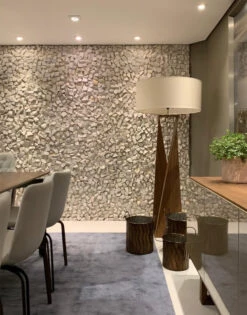 The Spin Floor Lamp is a stunning sculpture of angled Natural Wood Veneer topped with a White Linen drum shade.