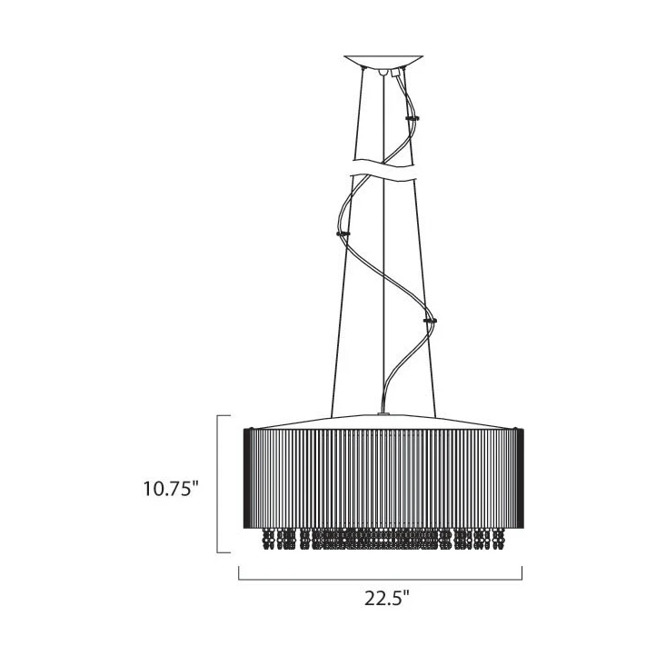The Spiral Collection’s twisted metal tubing sparkles like diamonds in the sun. Strands of high quality K9 crystal beads add to the impact making this fixture look as brilliant on as it does off. Features aluminium tubing with crystal bead stands and a polished chrome finish. Available in a 17, 23 and 32 inch wide option as well as a wall sconce, ceiling flush mount, pendant, linear suspensoin and chandelier version. Includes 130 inch wire. Ten 40 watt, 120 volt, T4 G9 bas halogen lamps inclued. General light distribution. UL listed. Suitable for dry locations. Maximum overall height is 130 inches. 22.5 inch diameter x 10.75 inch height.