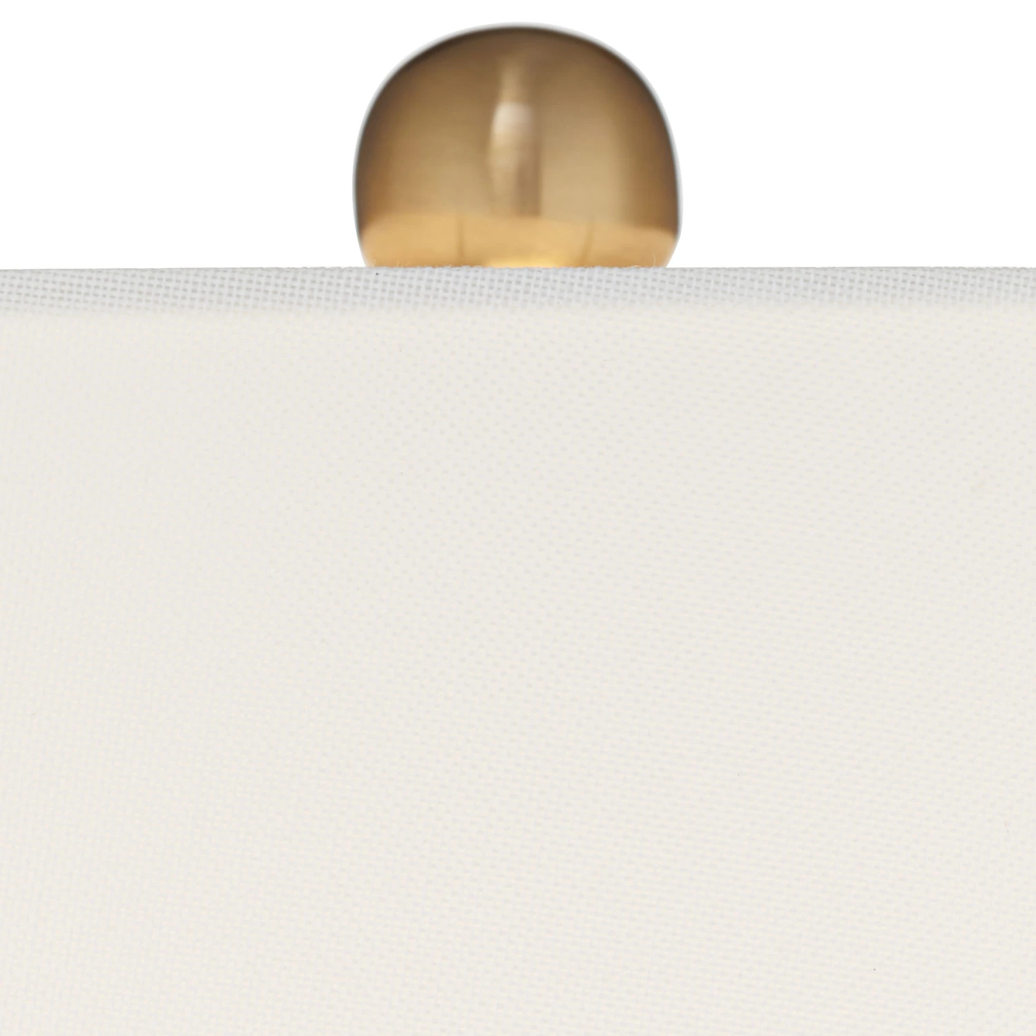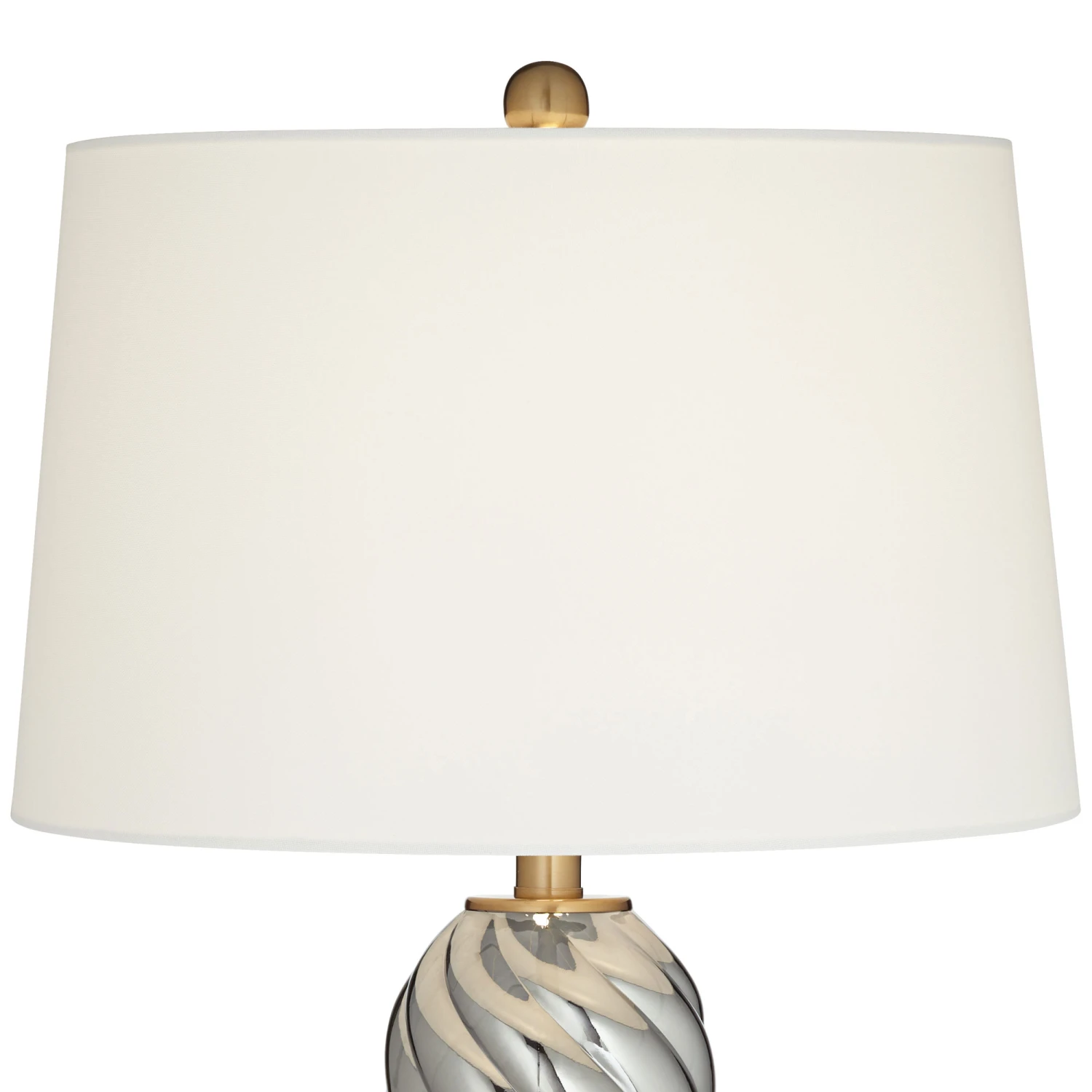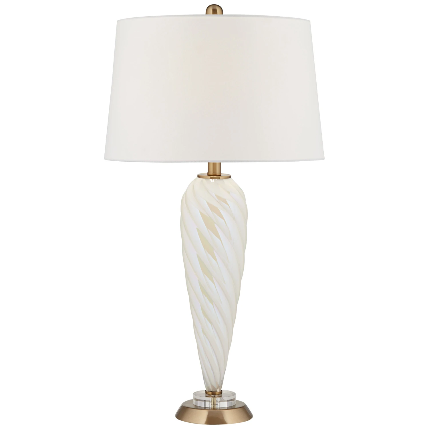 The dramatic tapering and spiral texture of the Spire Table Lamp will attract eyes in any setting. The twisted glass body stands atop a tiered base of clear glass and brass-toned sloping metal. A drum shade introduces an element of modern simplicity as well as providing diffused illumination. On/off switch located on socket.