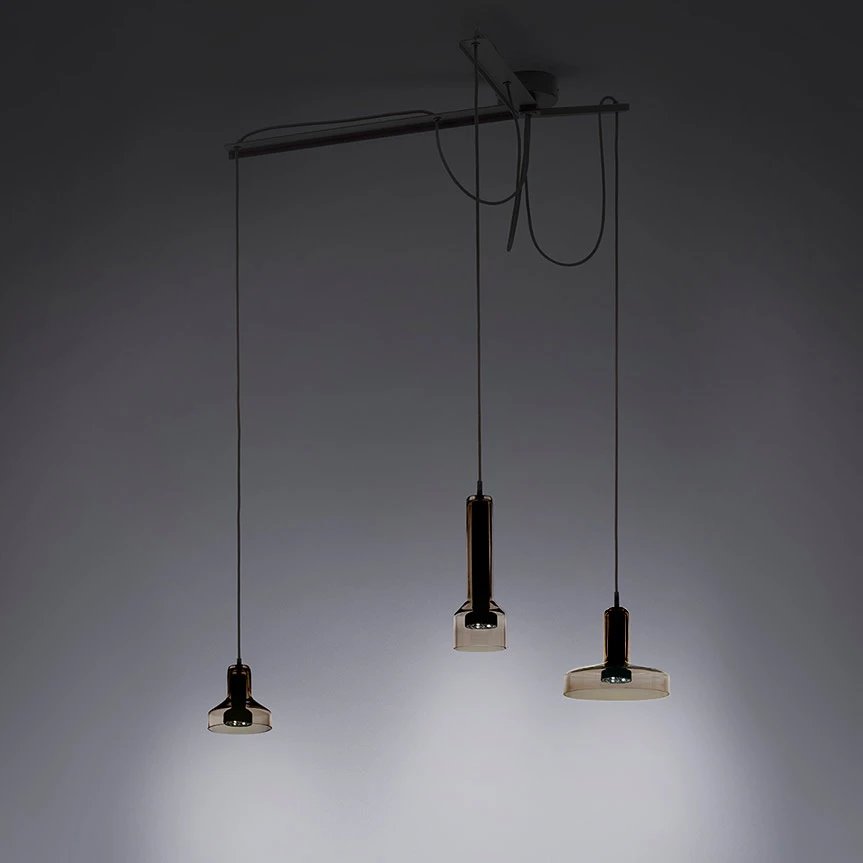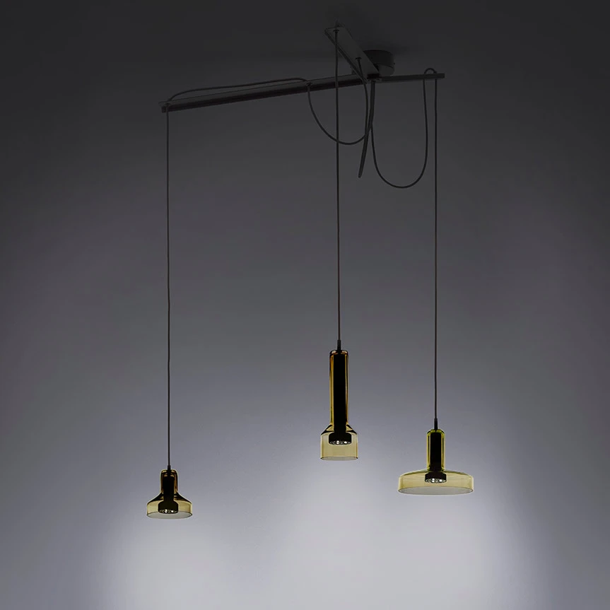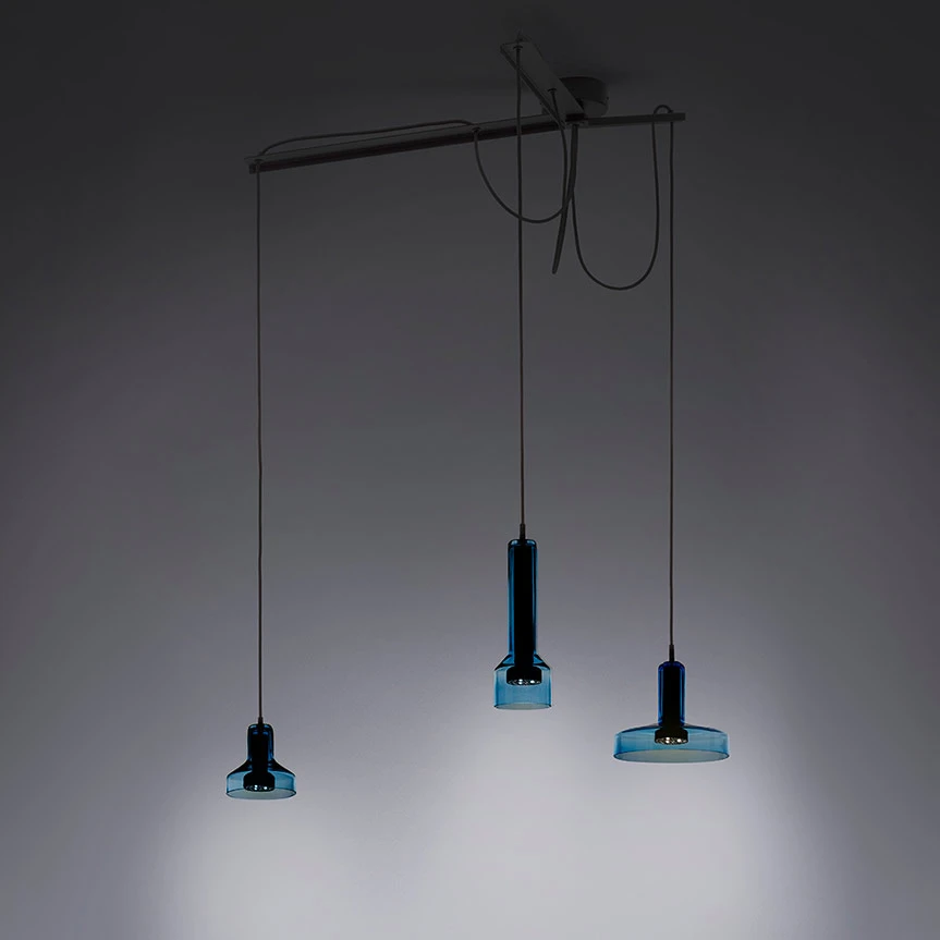 The Stablight Triple Pendant is produced using very traditional glass blowing techniques. Available with Aqua Clear, Brown Clear, or Green Amber Clear glass diffusers and a Black finish. Chose all pendants to be the same color or one of each color. Three 10 watt max 120 volt GU10 base LED retrofit bulbs are required, but not included. 28.75 inch width x 10.6 inch height x 15.2 inch depth. UL listed.
