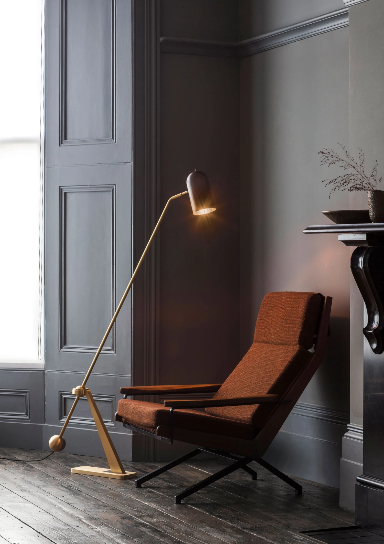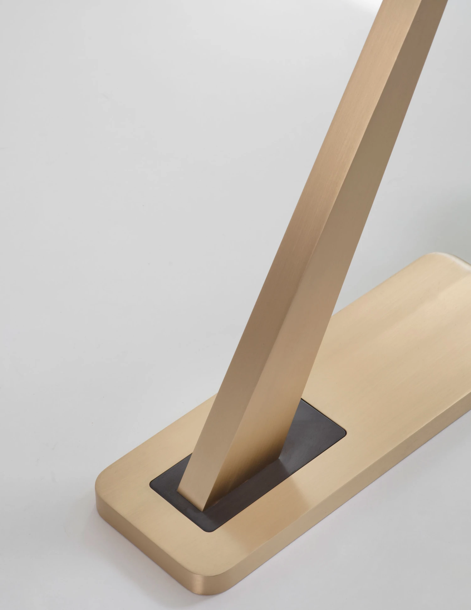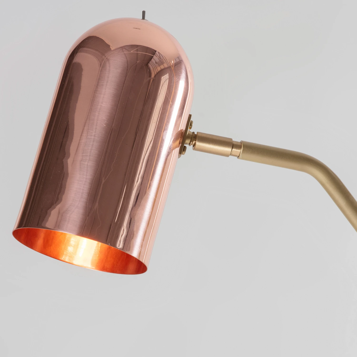 The Stasis Floor Lamp combines form and function with a sleek, eye-catching design. The angled, adjustable brass arm is capped by a dome shaped metal lampshade. The shade can also be tilted to further aim the light precisely where it is needed. On/off switch located on top of lampshade.