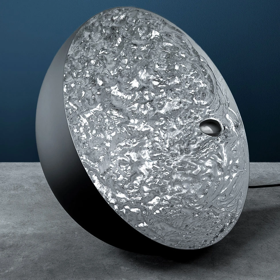 The Stchu-Moon Dome Floor Lamp features a dome shape lined with a roughly textured, metallic leaf material. When illuminated by the integrated LED light sources, the metallic leaf amplifies the light and appears to take on a glow of its own. Dimmer switch and low voltage driver located on cord.