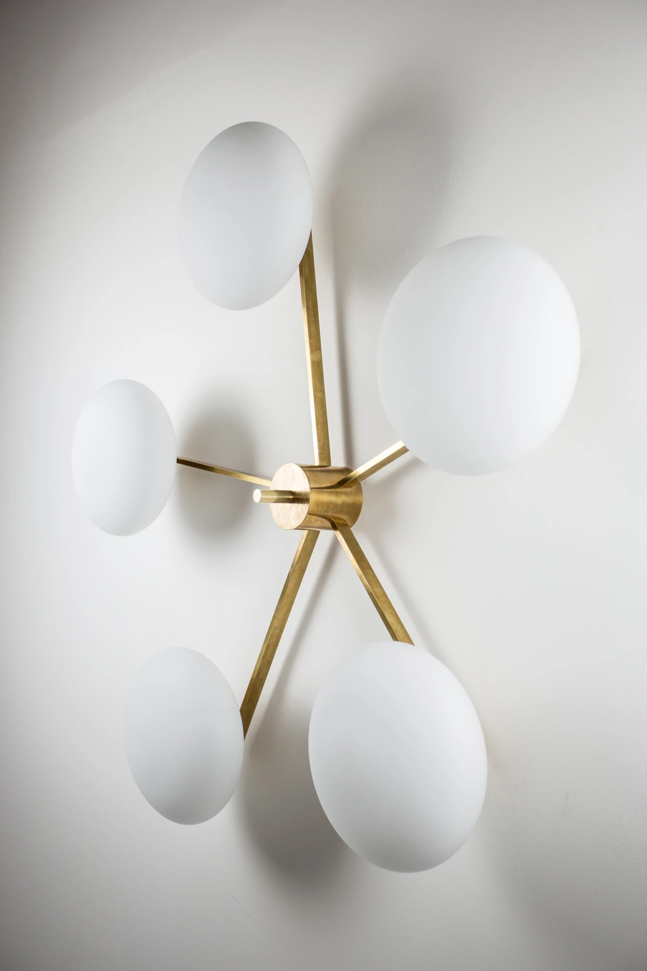 The Stella Daisy brings elegance to midcentury design through the inspiration of Italian designer Angelo Lelli. A handmade Brass body is arranged in an innovative pattern to display a collection of opaque Murano glass globes. Once illuminated, the Stella Daisy shines with luster and instantly adds sophisticated ambiance to your space. Available with a Brass, Blackened, Bronze, Chromed Lucid, Chromed Opaque, Polished, Polished Brushed, Unpolished Balanced, Unpolished Balanced, and Unpolished Opaque finish. Handmade in Italy. UL listed.