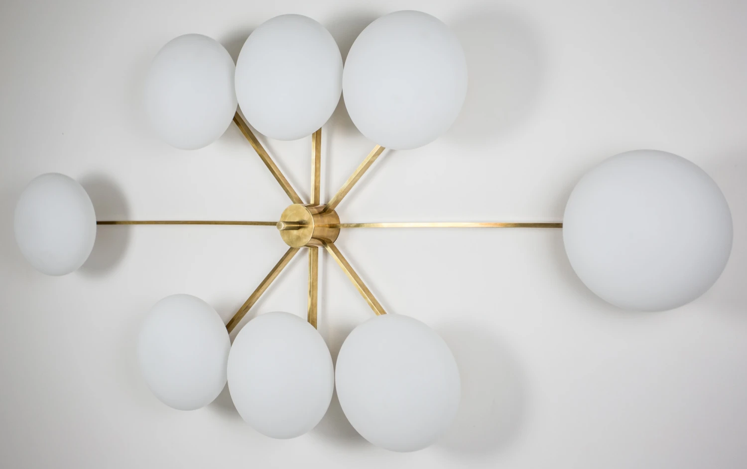 The Stella Evening brings elegance to midcentury design through the inspiration of Italian designer Angelo Lelli. A handmade Brass body is arranged in an innovative pattern to display a collection of opaque Murano glass globes. Once illuminated, the Stella Evening shines with luster and instantly adds sophisticated ambiance to your space. Available with a Brass, Blackened, Bronze, Chromed Lucid, Chromed Opaque, Polished, Polished Brushed, Unpolished Balanced, Unpolished Balanced, and Unpolished Opaque finish. Handmade in Italy. UL listed.