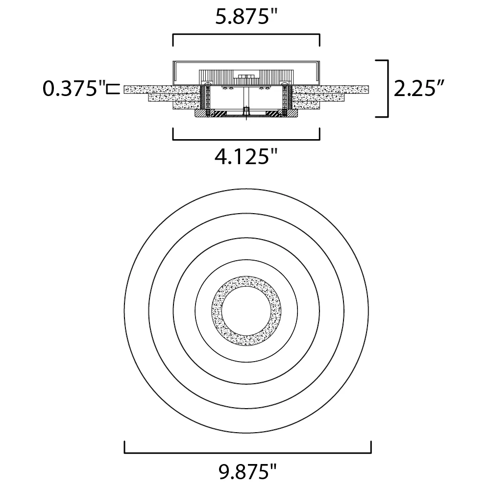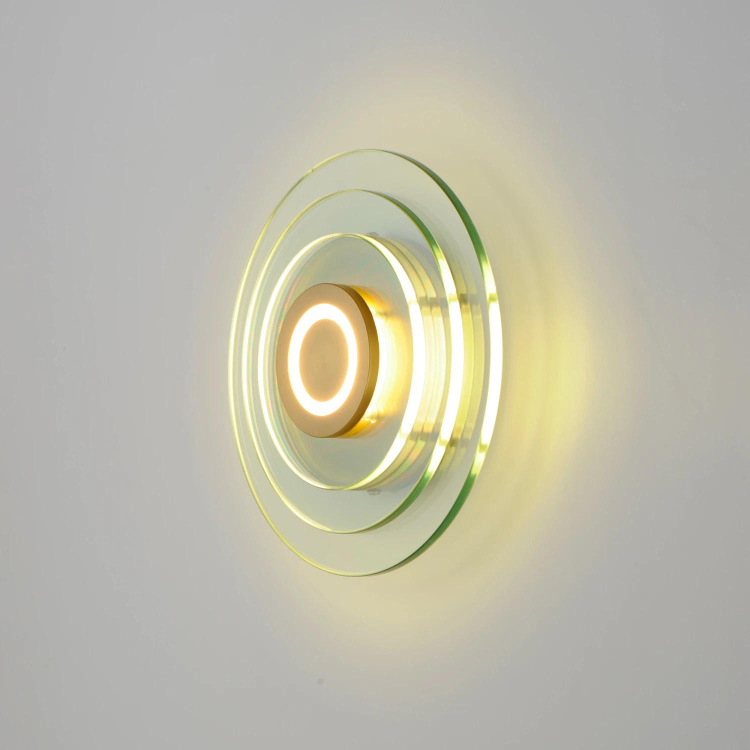 A series of thick glass circles are layered behind a disc finished in Natural Aged Brass, forming the unique Stratum Wall / Ceiling Light. An LED ring shines on the golden disc and light is emitted from behind in all directions, highlighting the curved, offset glass outlines. This eye-catching Stratum elevates your lighting design and can be installed as a semi-flush ceiling mount or wall mount.