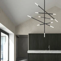 The Suspenders 14 Inch Flat Truss Pendant with (8) Power Precise Direct Mount Cylinders and (9) Power Precise Bar Mounted Aimable Cylinders. Finish in Satin Black. 5 inch diameter power feed with field-cuttable 6 foot cord hangers. Includes dimmable LED modules totaling 136 watts and a 120VAC input/24V output 300 watt remote transformer. UL listed.