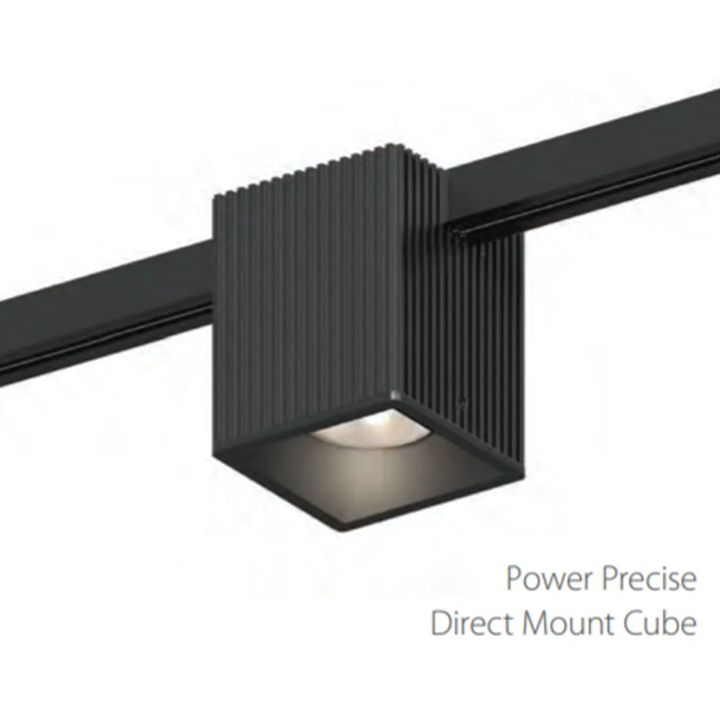The Suspenders Linear Pendant with (11) Power Precise Direct Mount Cubes. Finish in Satin Black. 5 inch diameter power feed with field-cuttable 6 foot cord hangers. Includes dimmable LED modules totaling 88 watts and a 120VAC input/24V output 300 watt remote transformer. UL listed.