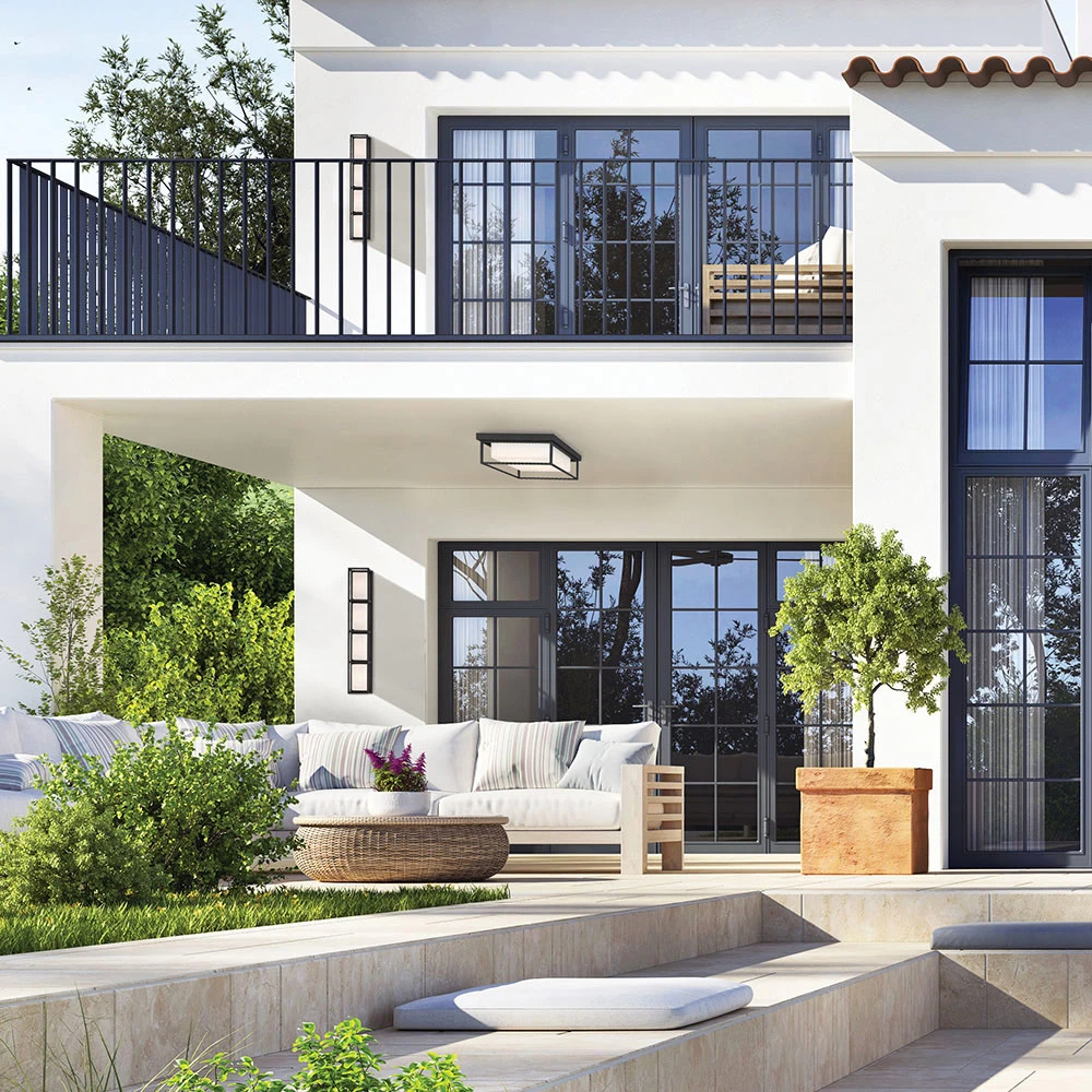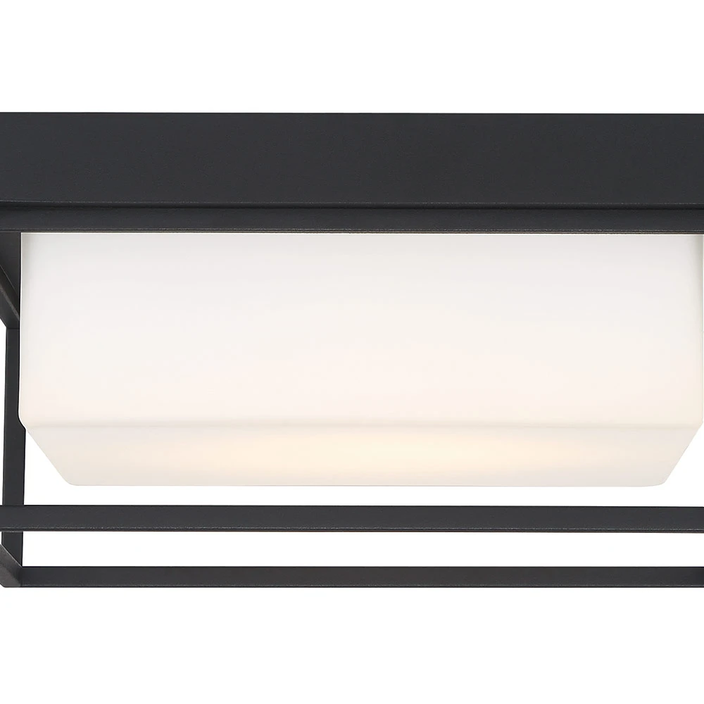 With a rectangular black open frame and opal white glass shade, the Tamar Outdoor Ceiling Light Fixture features a simple geometric design that integrates well into a range of design settings, both indoors and outdoors.