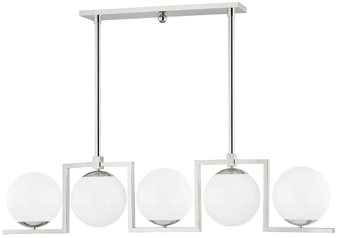 The Tanner Linear Chandelier is a spectacular geometric masterpiece, perfect in a variety of interior styles. Large Opal glass globes rest on a caps and placed on perpendicular arms in Polished Nickel or Aged Brass. Damp location rated. UL and cUL listed.