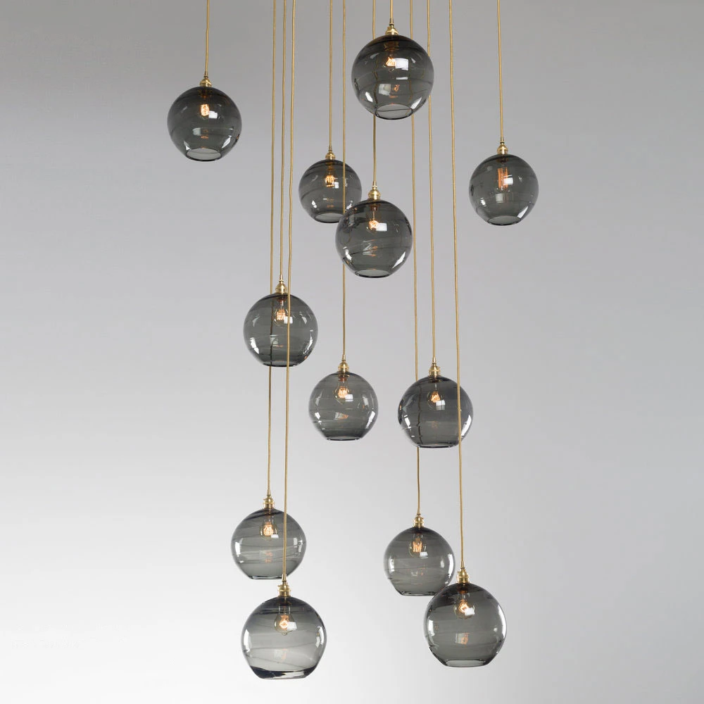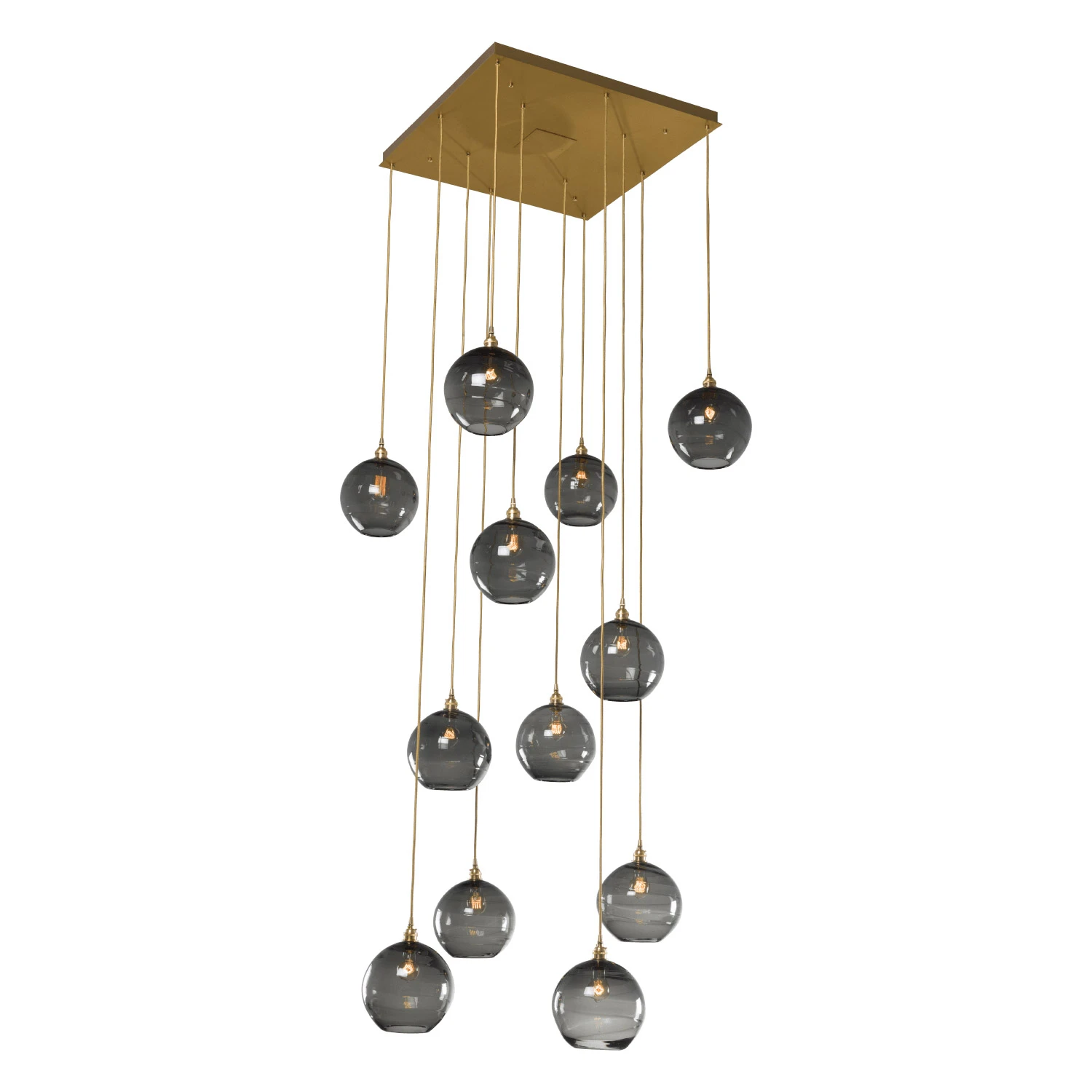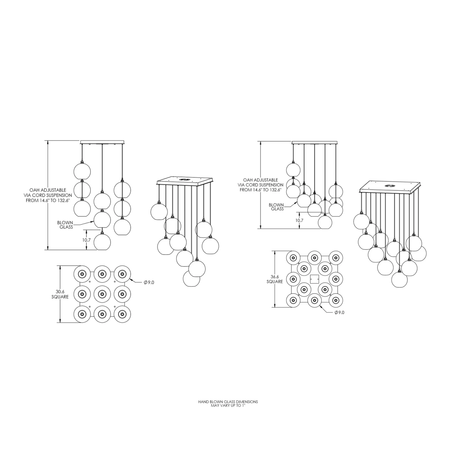 The Terra Square Multi Light Pendant is expertly crafted by artisans, the optic blown glass shades create a magical dance of light and color, particularly when paired with clear or vintage bulbs. Available with Optic Clear, Optic Bronze, Optic Amber or Optic Smoke glass shades with a Matte Black, Flat Bronze, Metallic Beige Silver, or Gilded Brass finish and matching cords. Available with nine or twelve pendants. Varying shade height. 132.6 inch maximum length. UL listed. Made in the USA.