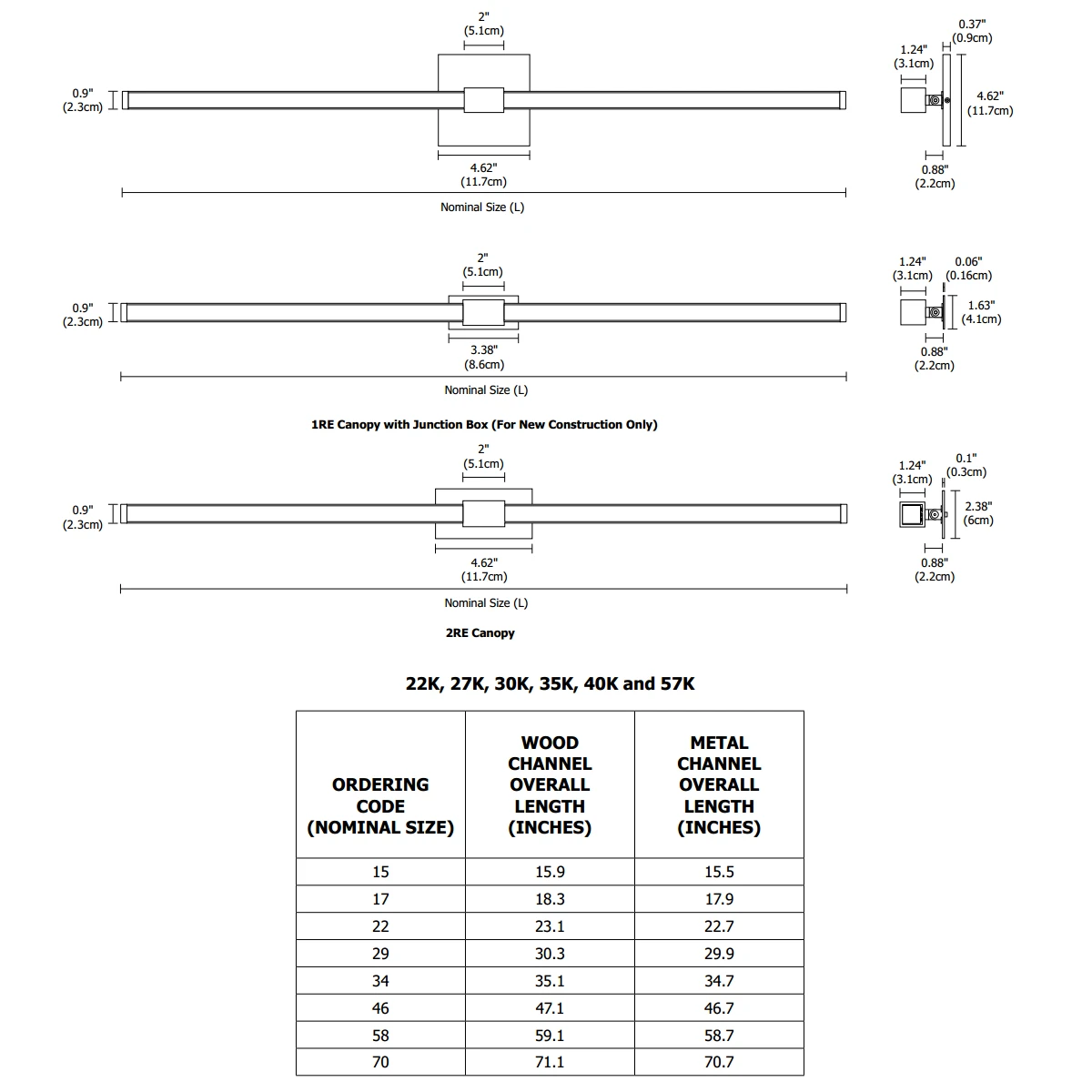 Tie Stix Metal Horizontal 2-Light Adjustable Wall Light with 2 Inch Rectangle, 1 Inch Rectangle, or 4 Inch Square Canopy features a direct flat, milky white lens with 100 degree beam spread and an integral swivel for adjustability. Metal channel finish options include Satin Nickel, Chrome, Antique Bronze, Satin Black or White. Canopy and hardware are offered in Satin Nickel, Chrome, Antique Bronze, Satin Black or White finish. Includes 5 watts LED per foot in a spectrum of color temperature options, including Warm Dim, and lengths from 15 to 70 inches. 4SQ canopy mounts to standard 4 inch square electrical box with round plaster ring. 2RE mounts to standard 4 inch electrical box with single gang plaster ring or single gang electrical box. 1RE mounts to Slim Profile Junction Box (included) in new construction applications. Power supply fits inside electrical box.