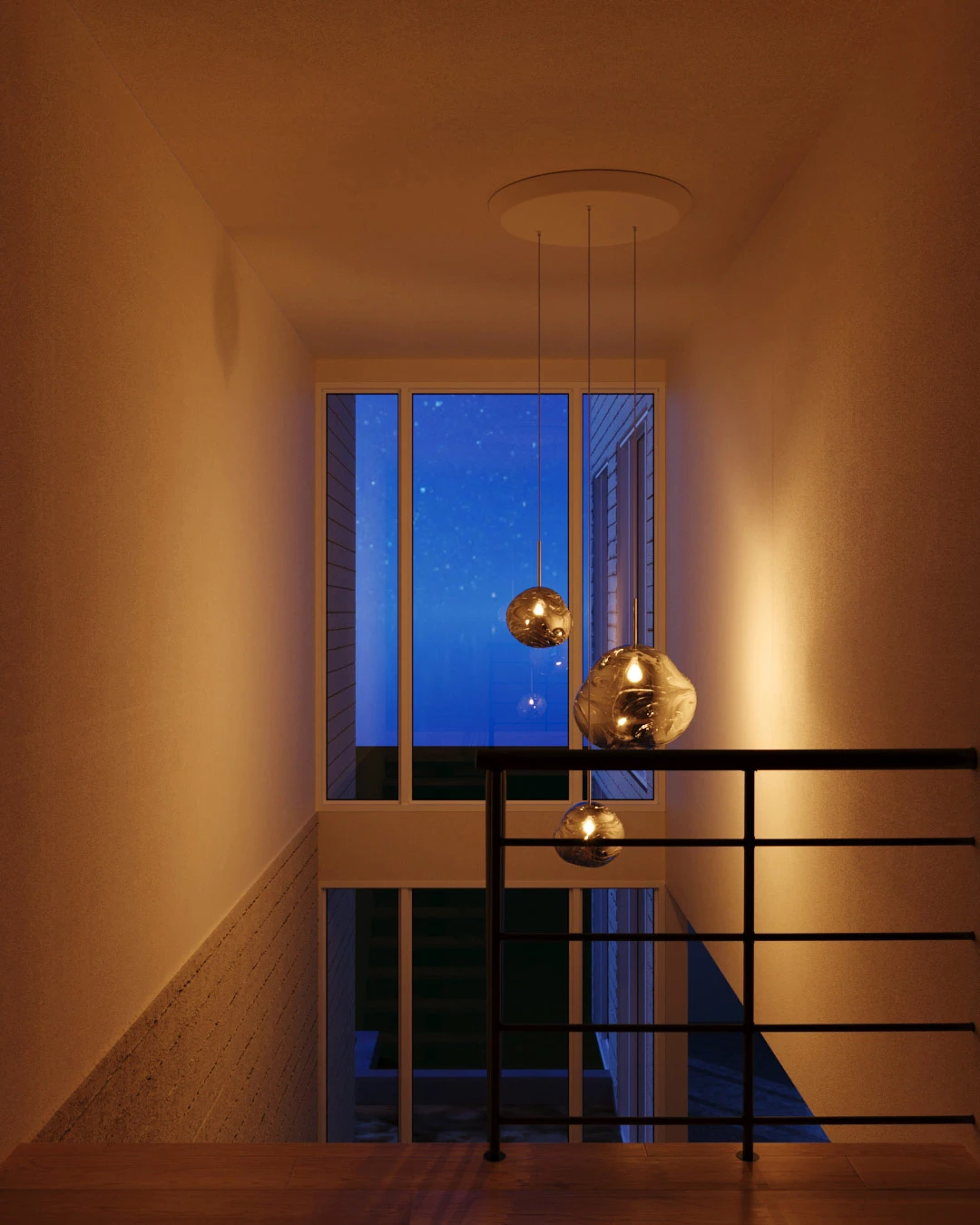 The Melt Multi Light Pendant is an obsessed with the idea of creating an imperfect, organic and naturalistic lighting object. Created in collaboration with FRONT, a Swedish design collective. Melt is evocative of molten glass, the interior of a melting glacier, or images of deep space. Available as a cluster of three or five pendants of varying shapes and sizes in Chrome, Gold, or Copper finish. When turned on, the pendants become a translucent textured color. UL and CUL listed.