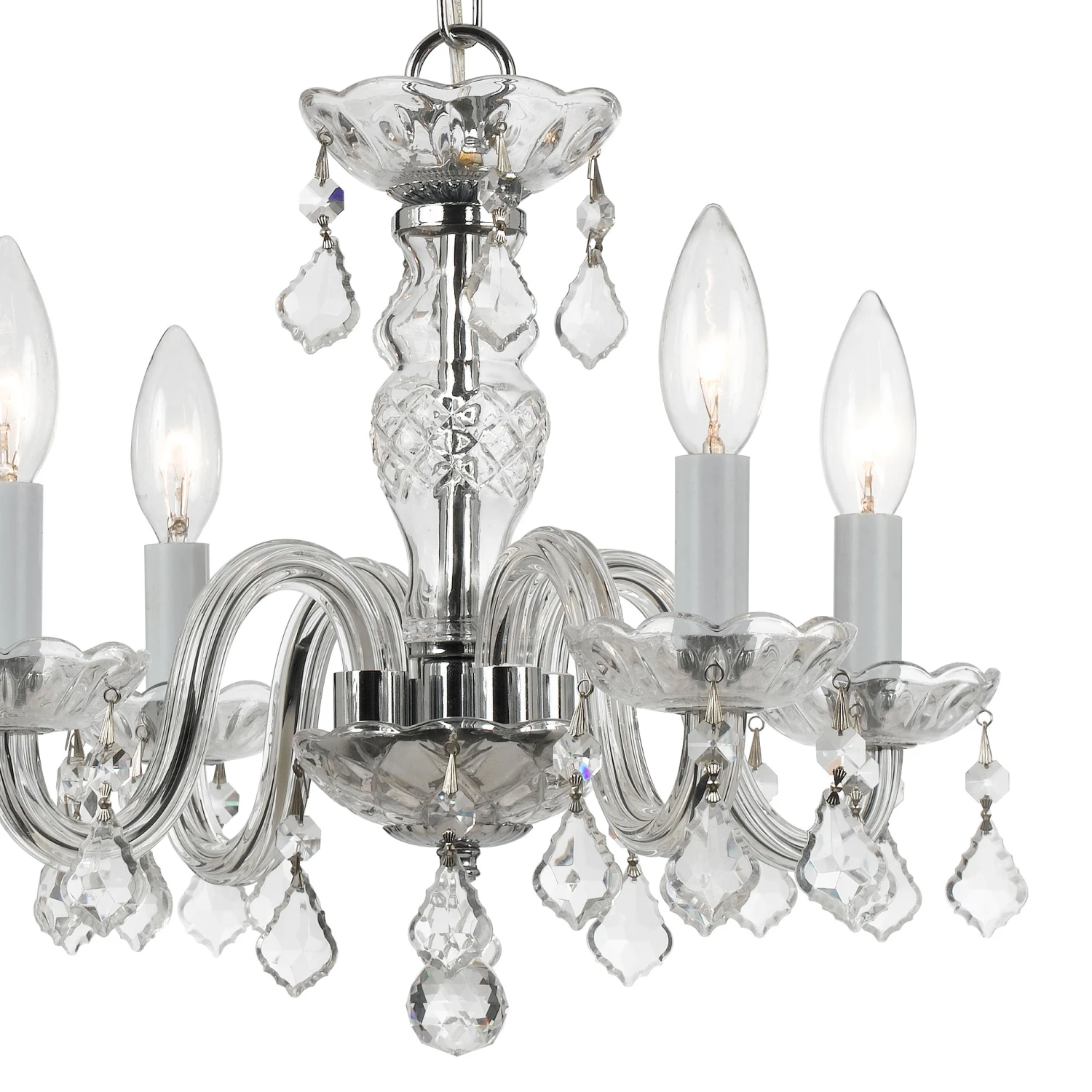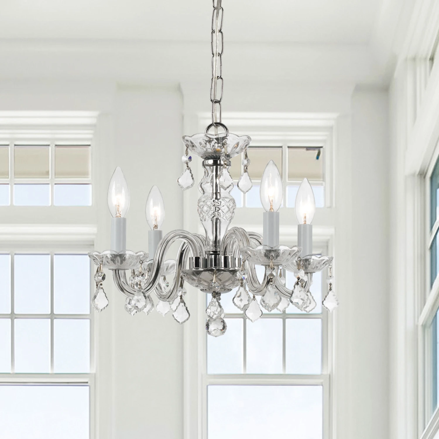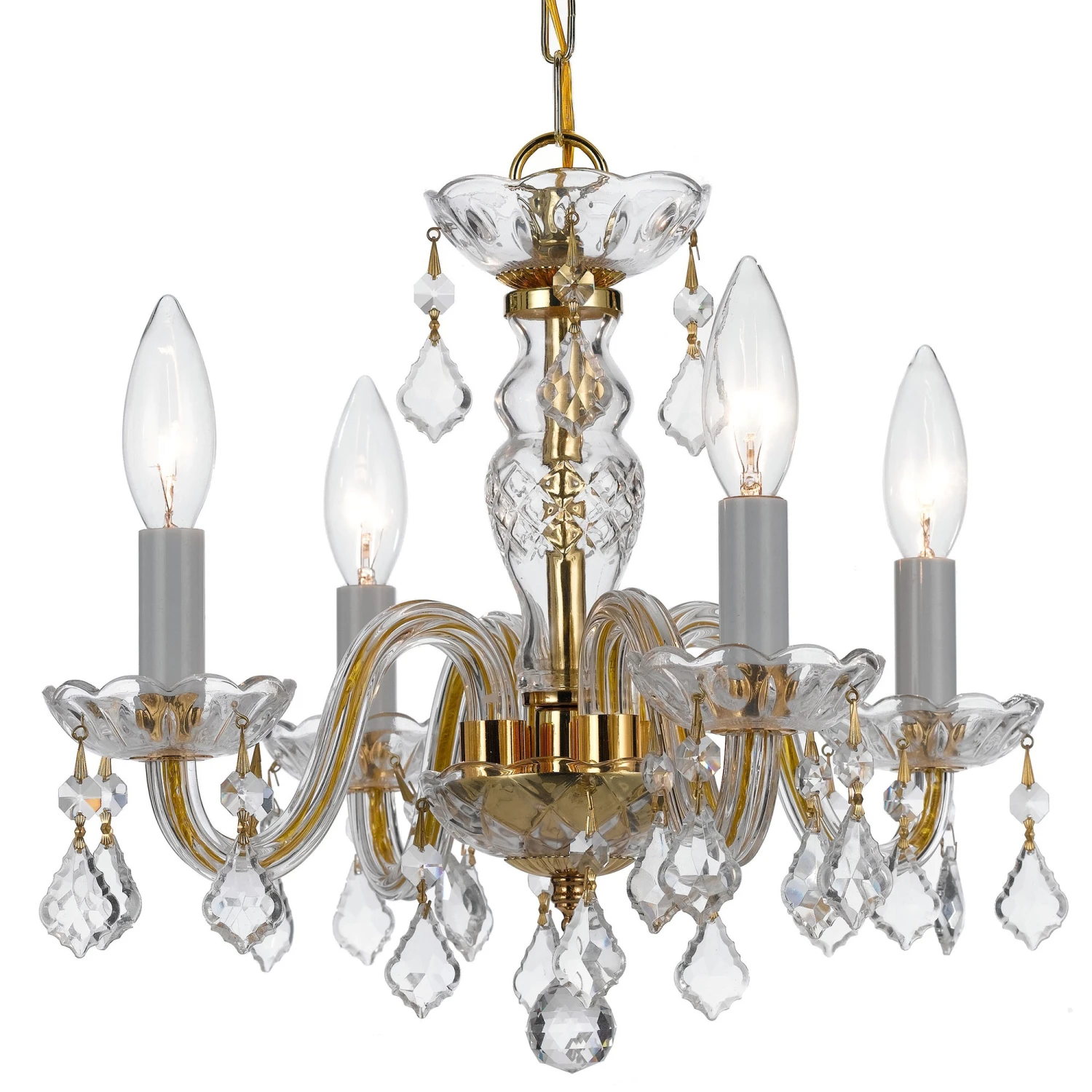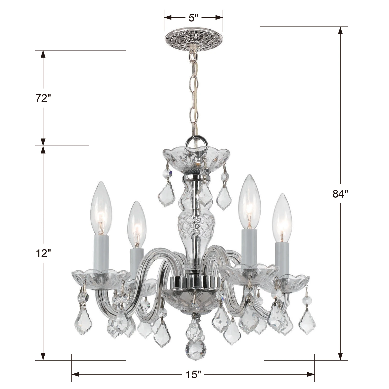Traditional Crystal 1064 Mini Chandelier is available in a Polished Chrome or Polished Brass finish with Hand-Cut or Swarovski crystals. Four 60 watt, 120 volt B10 type Candelabra base Incandescent lamps are required but not included. Includes 72 inch chain. UL listed.