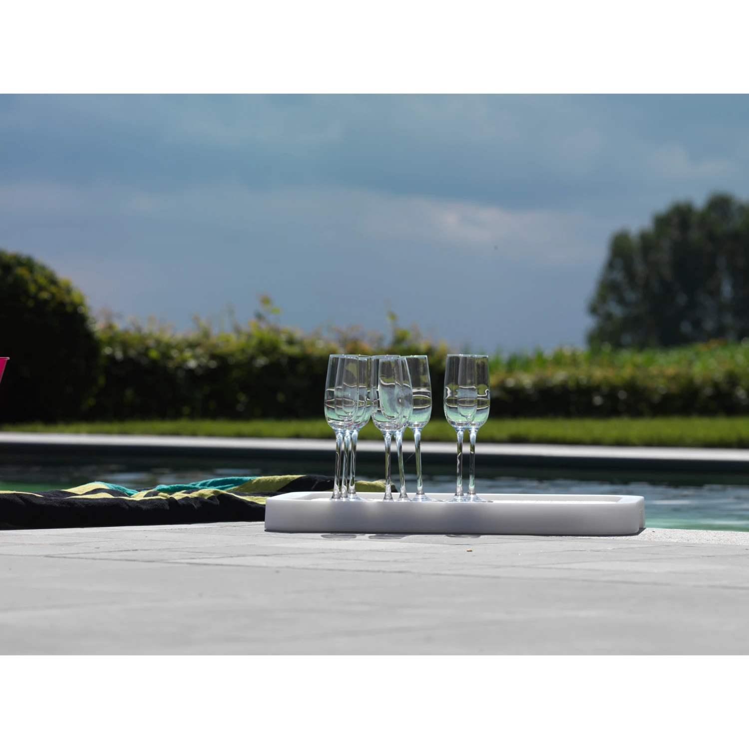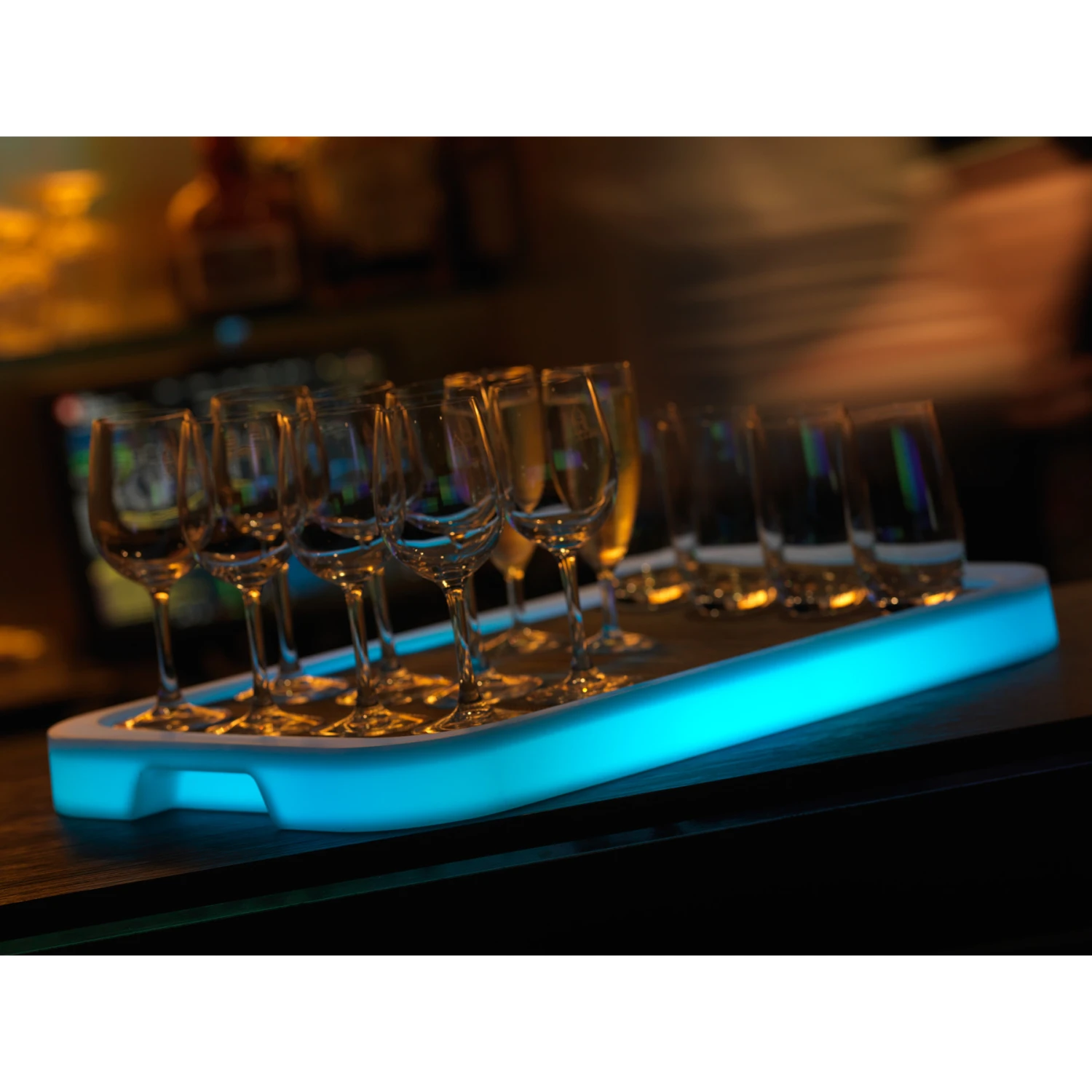 Tron Rectangle LED tray features a light polymer frame with a color mix mode and LED with 50,000 hour lamp life. Fifty-six 3.36-watt, 120 volt LED lamps included. Lamp temperature is a high white color. Dimensions: 22W x 1.8H x 14L.