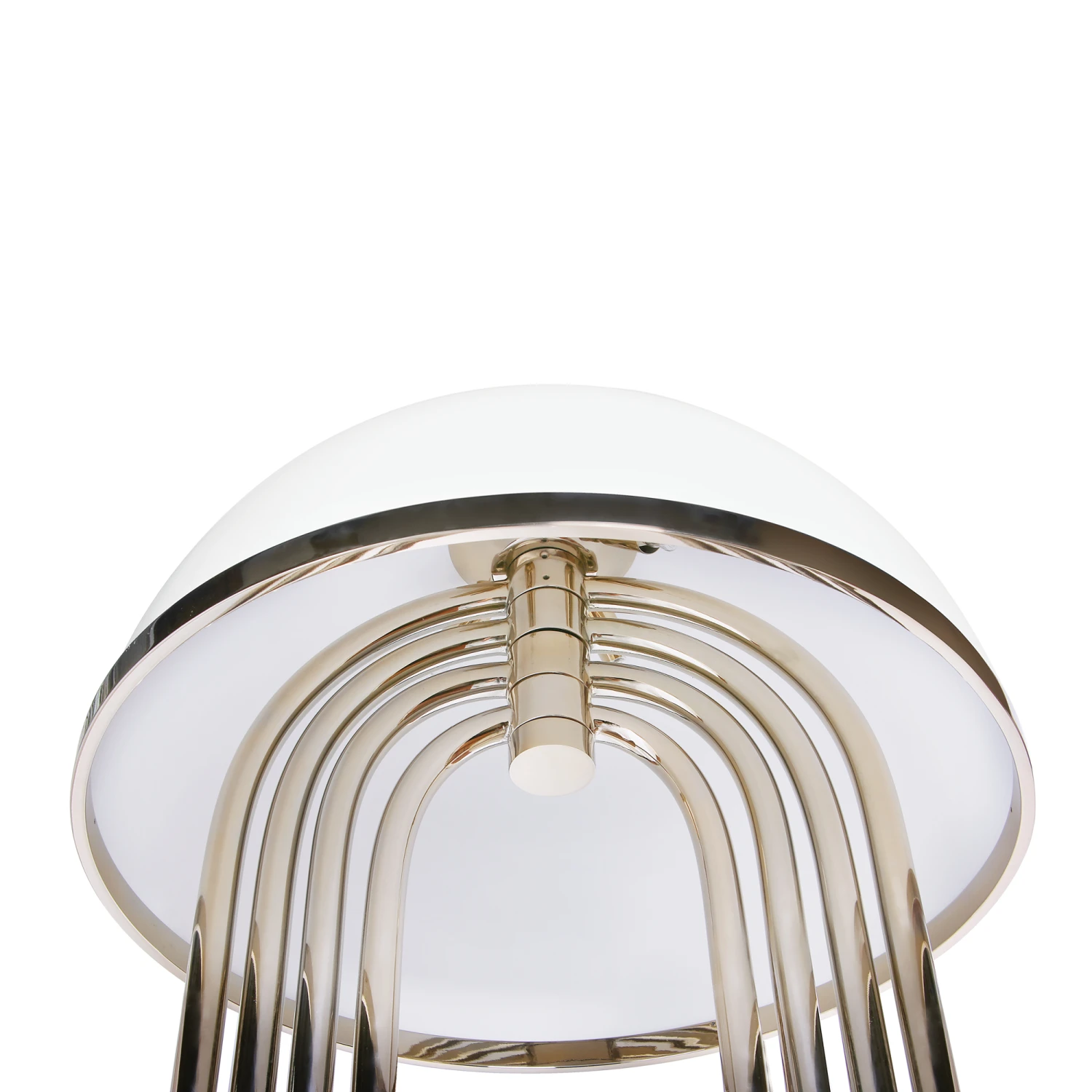 Turner Floor Lamp was inspired by Tina Turner’s dance moves with its art deco shape and the rotating arcs to position so that you can create your favorite composition at any time. Made of brass in a Gold plated finish and aluminum shade in Matte White with Gold powder coat paint inside. Four 40 watt, 120 volt JCD type G9 base halogen bulbs are required, but not included. 19.7 inch width x 66.9 inch height.