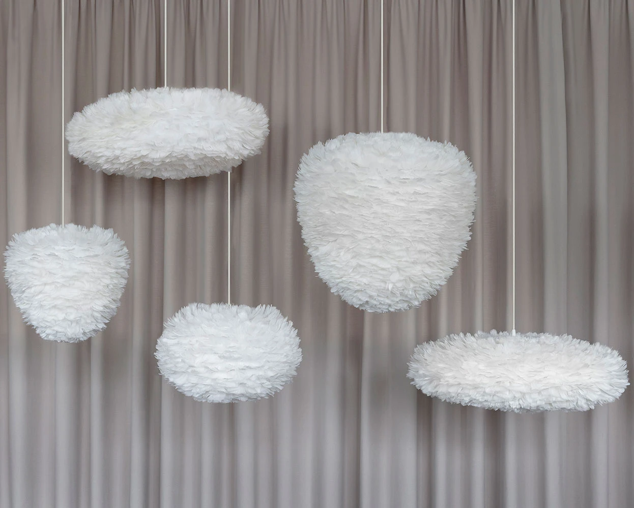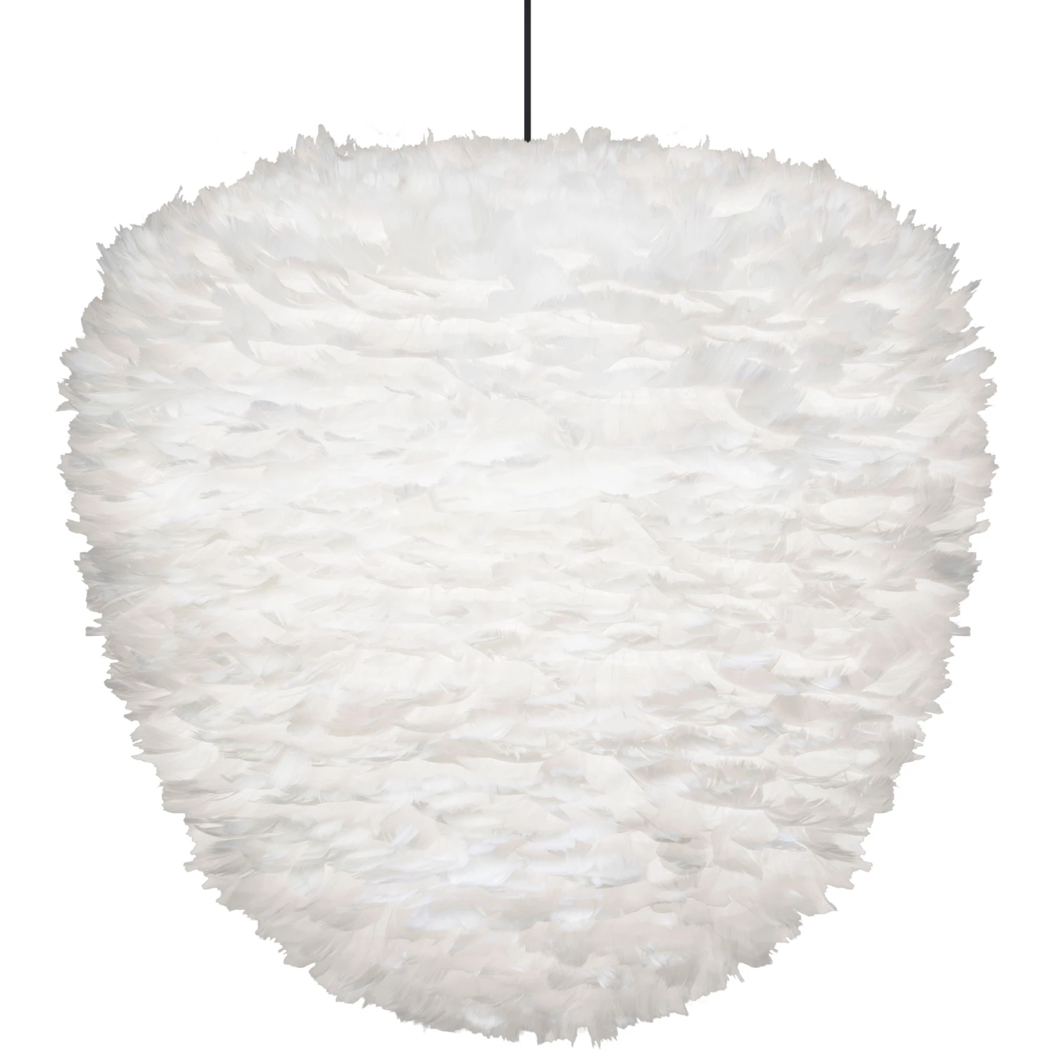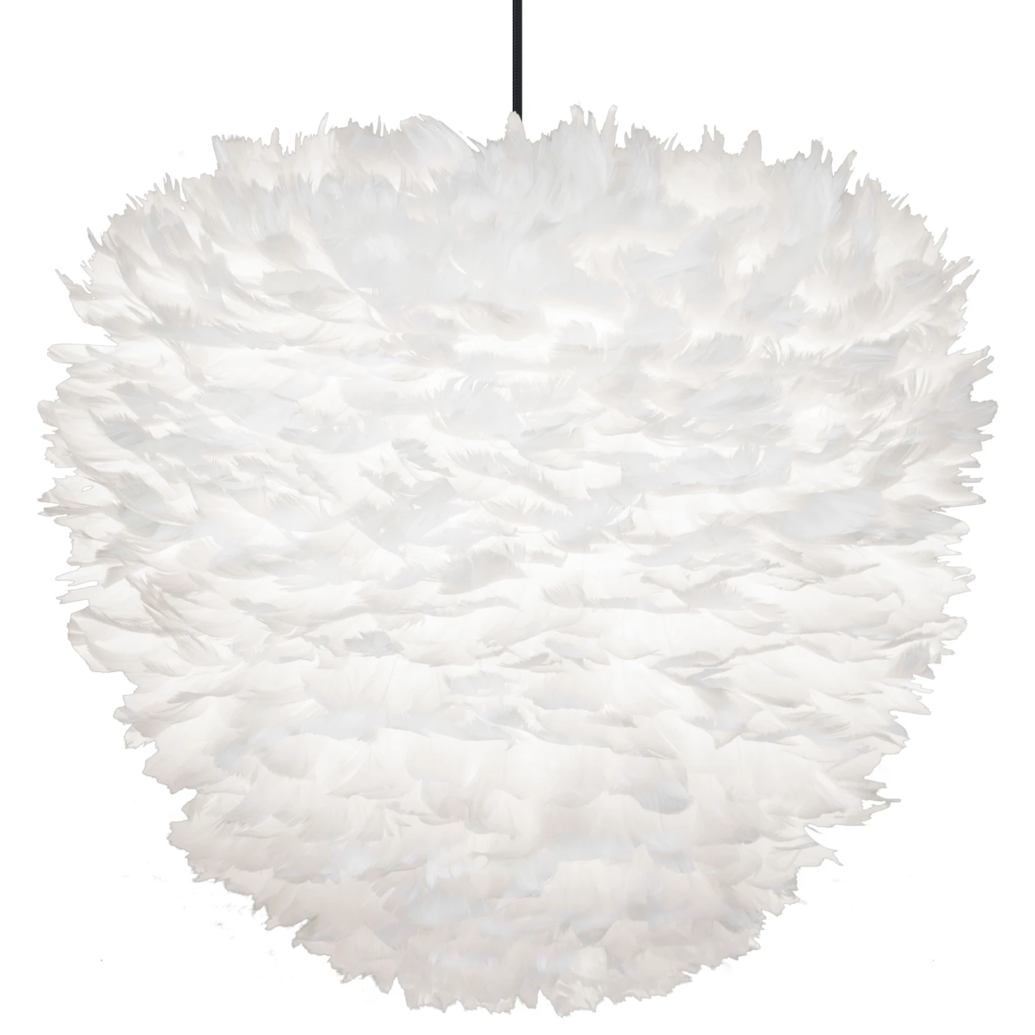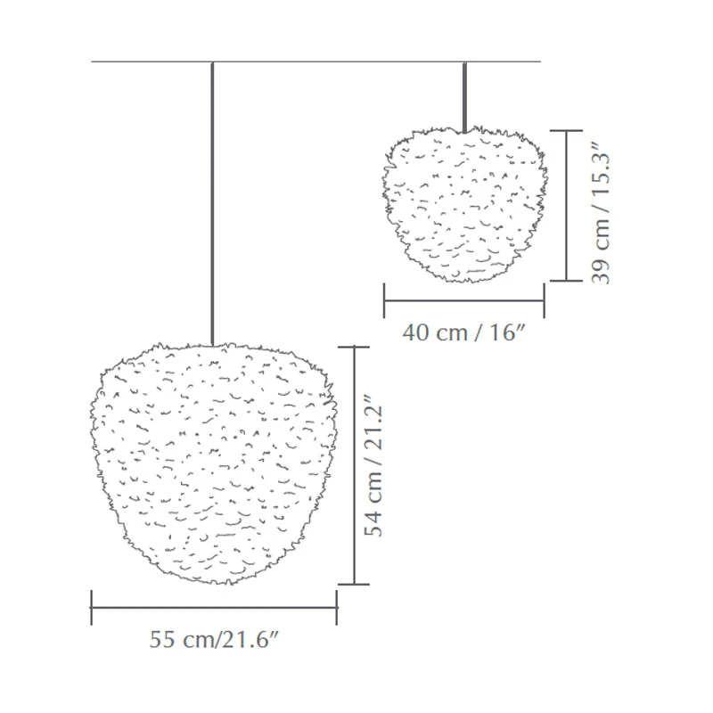 The Eos Evia Pendant draws its inspiration from natures beehives. This piece with its unique combination of shape and materials will be the center of attention in your room. Made from authentic White goose feathers, each carefully positioned on a paper core by hand. It radiates a cozy and pleasant glow. Routine cleaning is easily done with a hairdryer. Available in two sizes with White or Black cord with a canopy – hardwired or plug-in. Small size has 2340 feathers and large size has 4500 feathers. UL listed.
