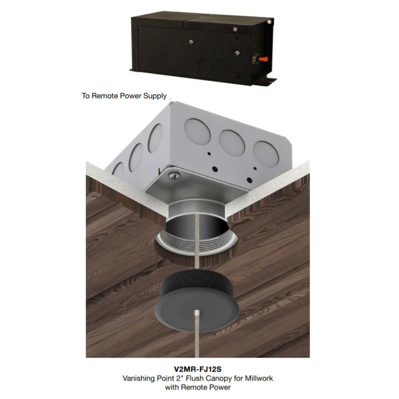 The Vanishing Point 12VAC Fast Jack 2IN Canopy features a features a 2 inch round canopy which sits flush in millwork ceilings. Finish in Antique Bronze, Black or Satin Nickel. Requires a 120-12VAC power supply, sold separately. Finish in White. Product is built to order. Compatible for use with any 12V Fast Jack, Freejack, EZ Jack, Quick Connect or Unijack fixture, sold separately.