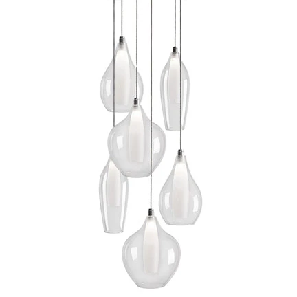 The Victoria Multi Light Pendant features three styles of pendant with Clear outer glass and Frosted inner glass. Available with 3, 6, 9, or 12 pendants suspended from a round Chrome canopy.