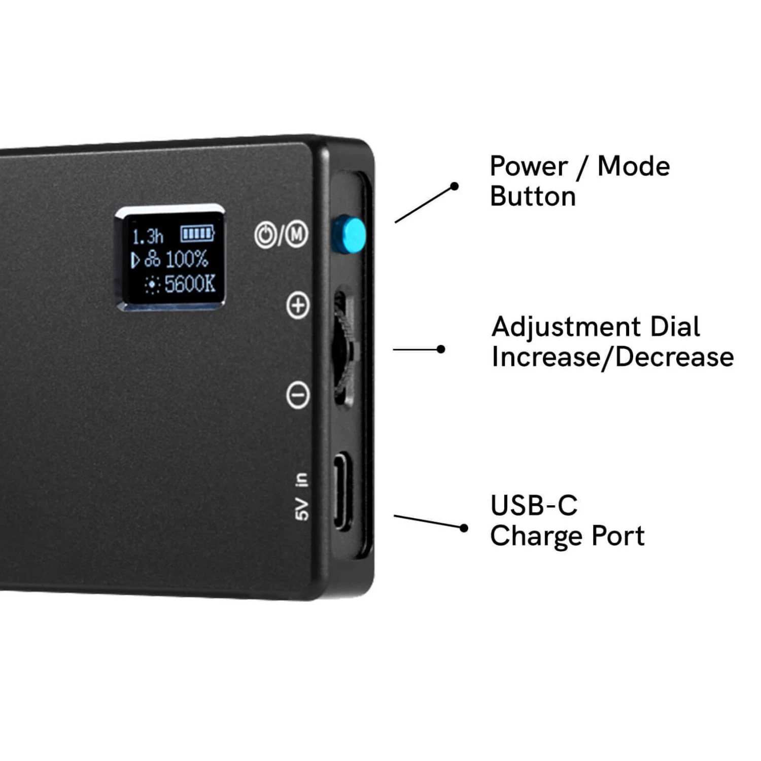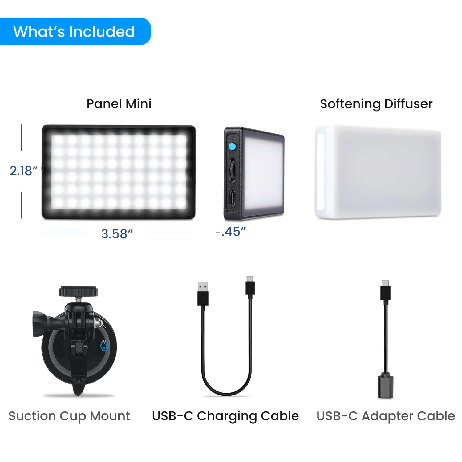 It includes a Panel Mini LED light which produces 550 lux at 0.5 meters, features adjustable brightness and color temperature (3200K-5600K), and has an LCD screen on the back displaying settings and battery life. The brightness and color adjustment dial and on/off button are on the side of the light. The suction mount attaches the light to your device. The kit also includes a silicone diffuser for softening the light, a USB-C charging cable and a USB-C adapter.