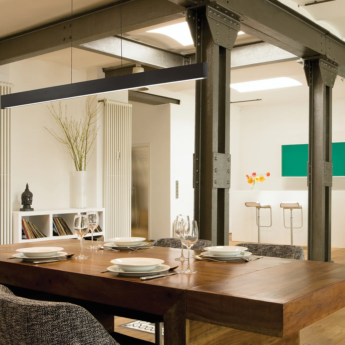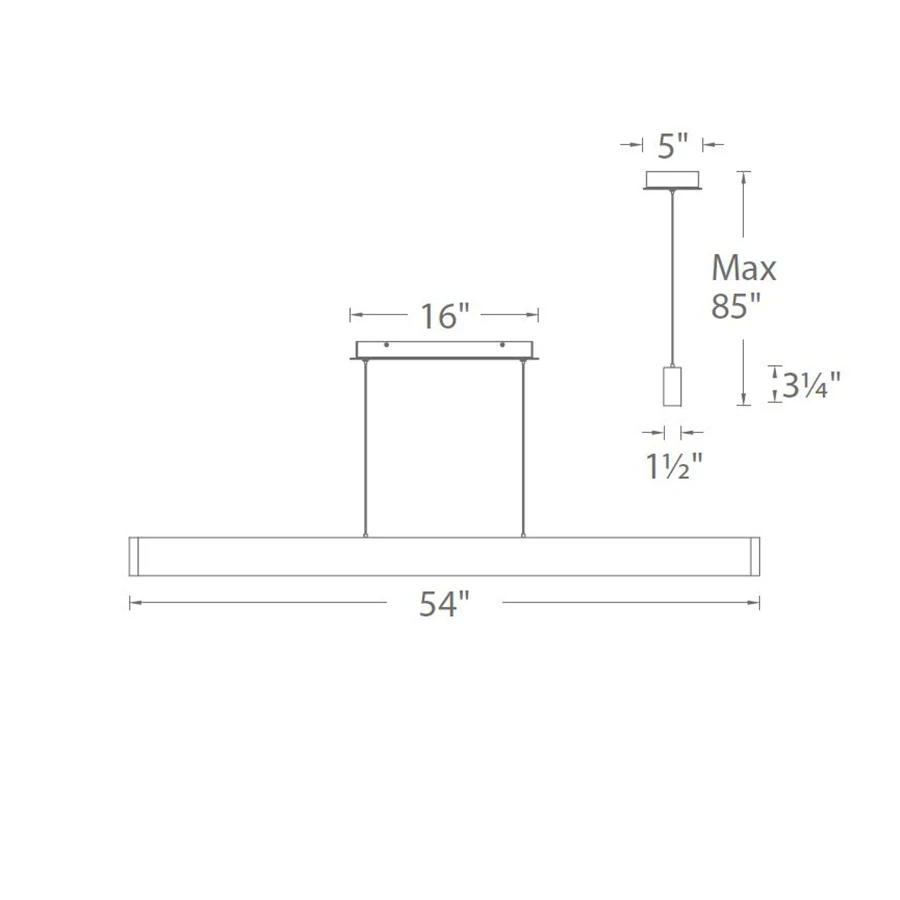 The Volo Pendant is a luminous linear pendant with brushed metal finish and rounded ends. Available in Brushed Aluminum or Black finish. Adjustable to different lengths through push-pin locking canopy. One 56 watt, 2535 lumen 90CRI 3000K LED Module is included. 54 inch width x 3.25 inch height x 85 inch overall length. Damp location listed.