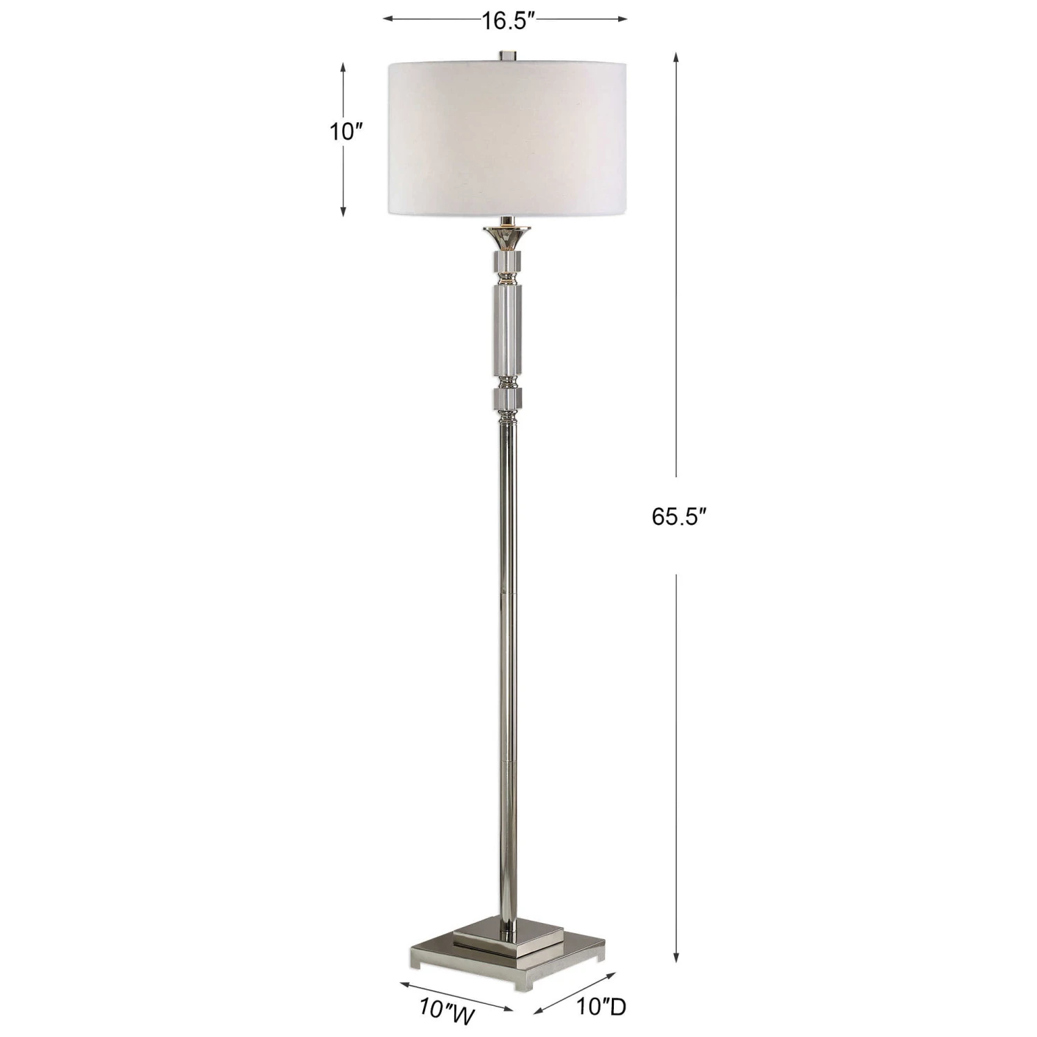 The Volusia Floor Lamp features stacked crystal blocks, accented with polished nickel plated details. The round hardback drum shade is a white linen fabric with light slubbing. 3-way socket switch.