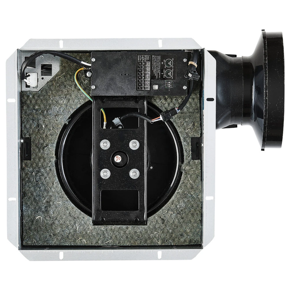 A high flow speed of 80, 90, 110, 120, or 140 CFM and a continuous lower speed can be set using switches in the fixture. The humidity sensor can activate high airflow when humidity rises above a level set by the user (50-100%), and a motion sensor activates the fan when someone enters the room.