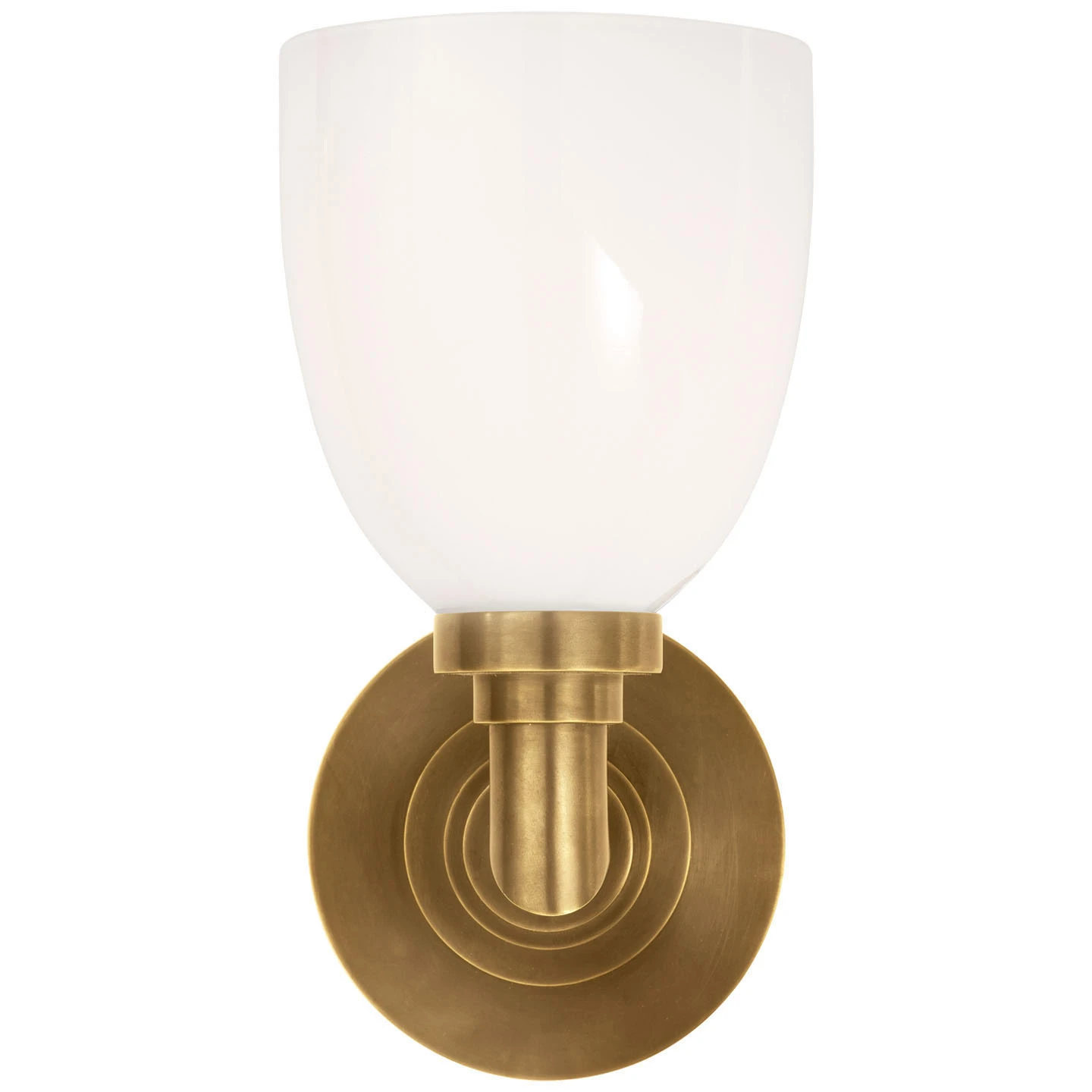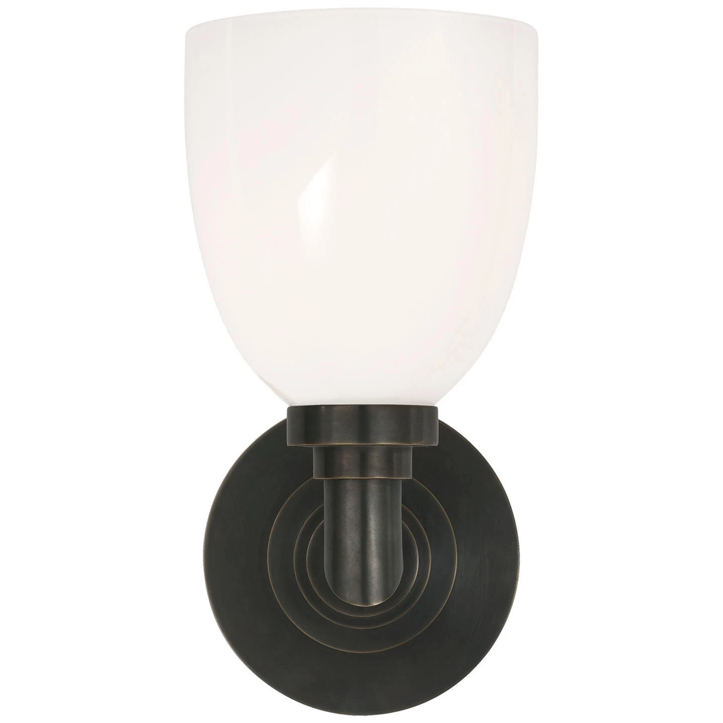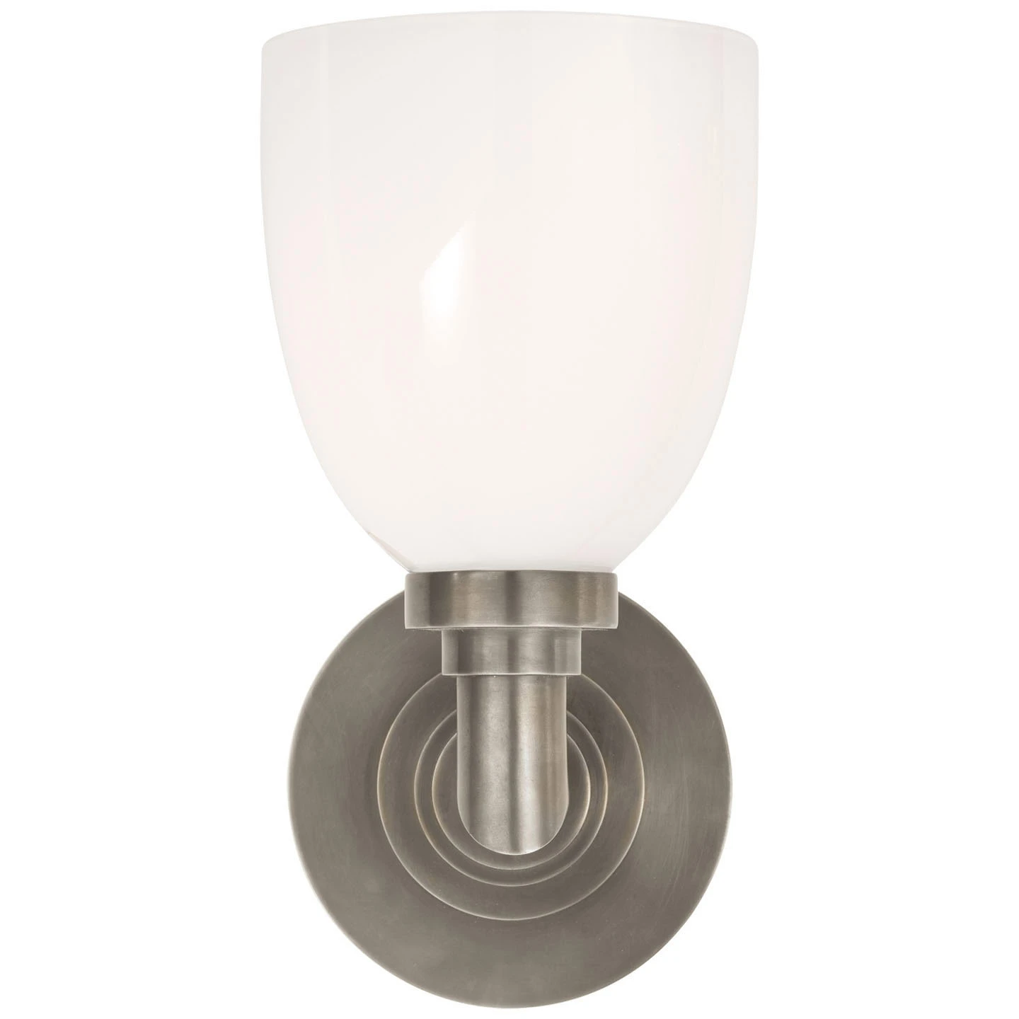 The Wilton Wall Sconce presents a clean, versatile aesthetic that blends seamlessly with many interior styles. A round metal backplate with step detailing is paired with a simple domed white glass shade. The shade gives off a diffused light for illuminating your bathrooom, powder room, or hallway.