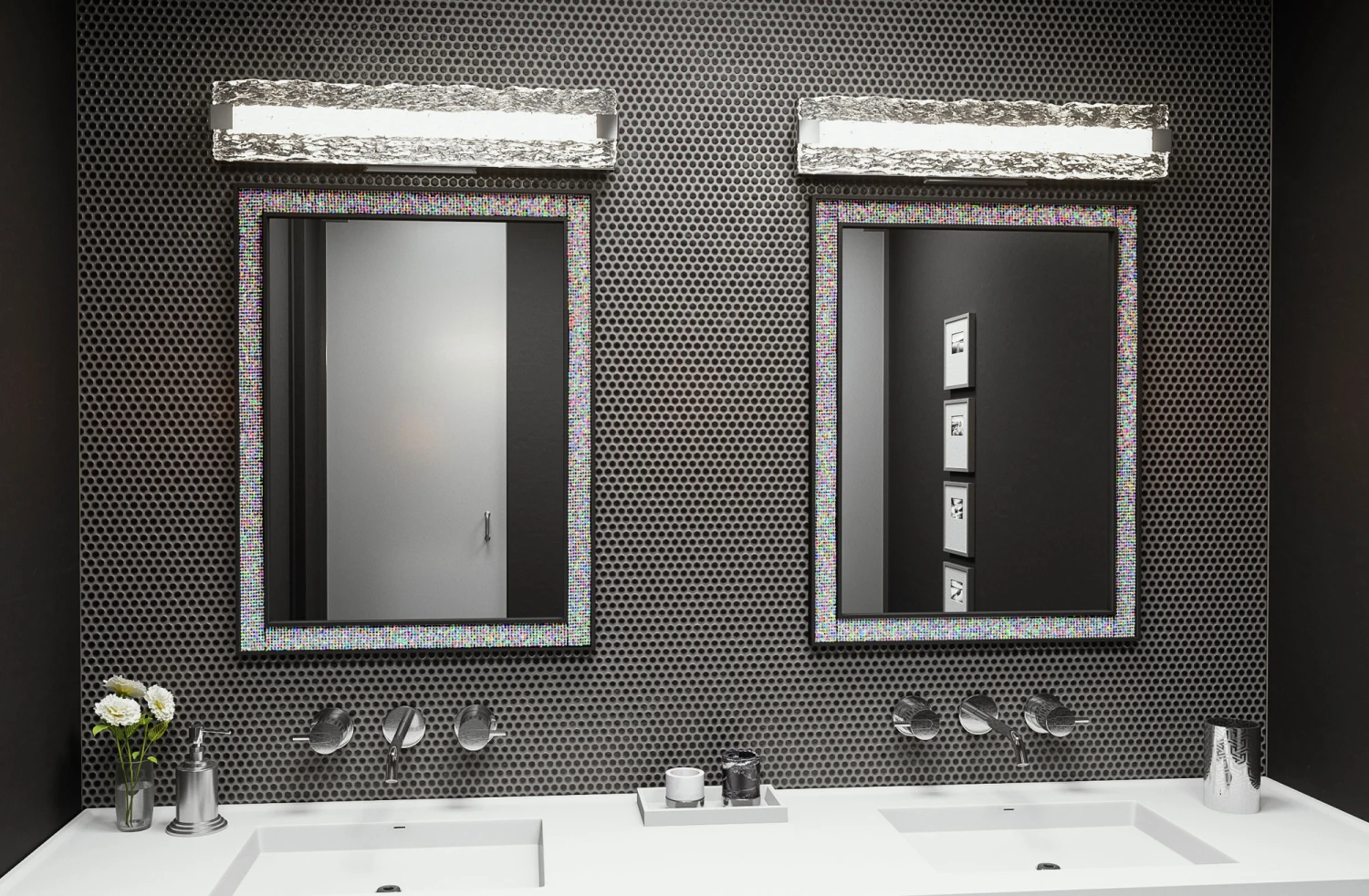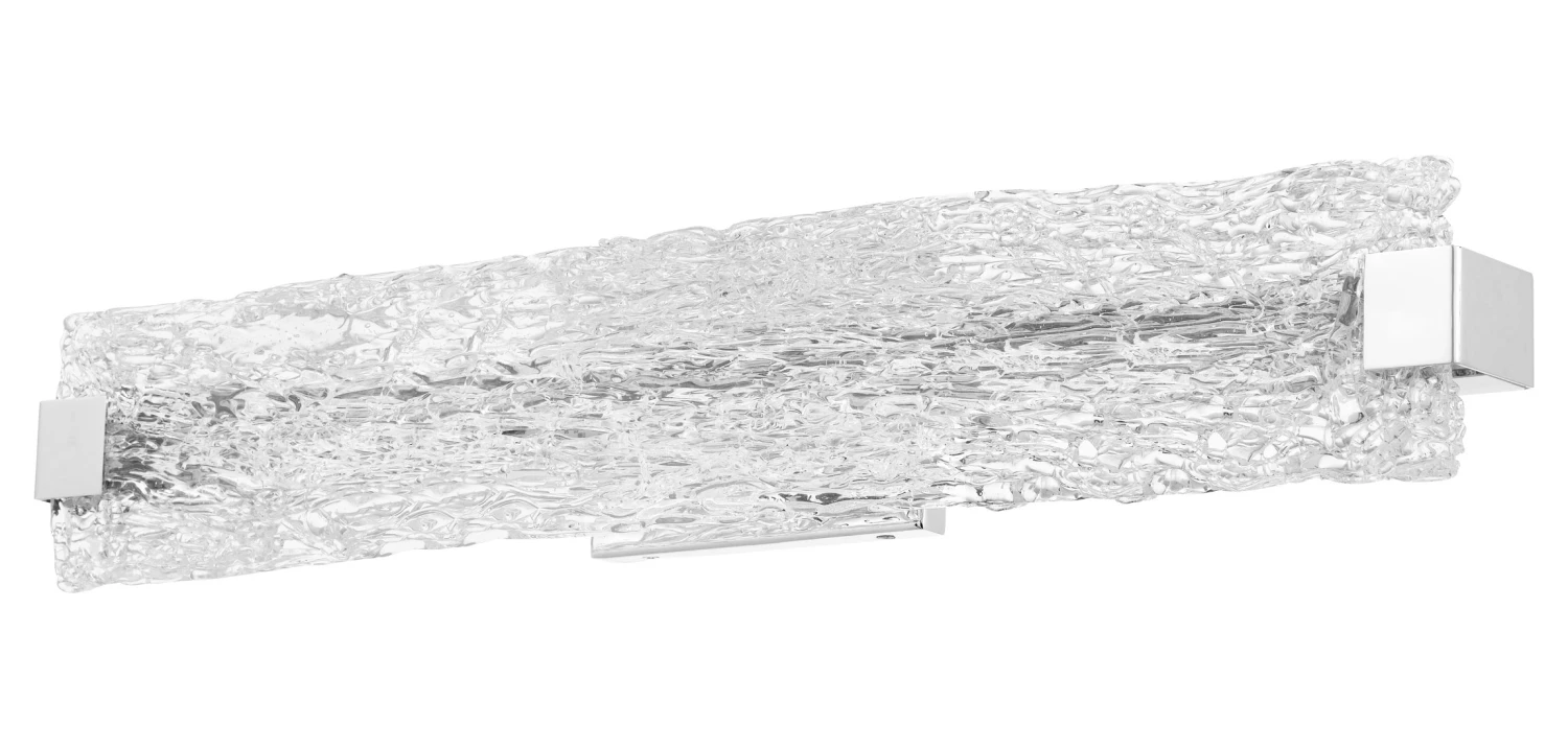 The Winter Bathroom Vanity Light features delicate sheets of Noodle glass giving off a unique sparkling effect. The backplate and side brackets are finished in a glossy Polished Chrome. Available in two sizes. Can be mounted horizontally or vertically. ETL rated for damp locations.
