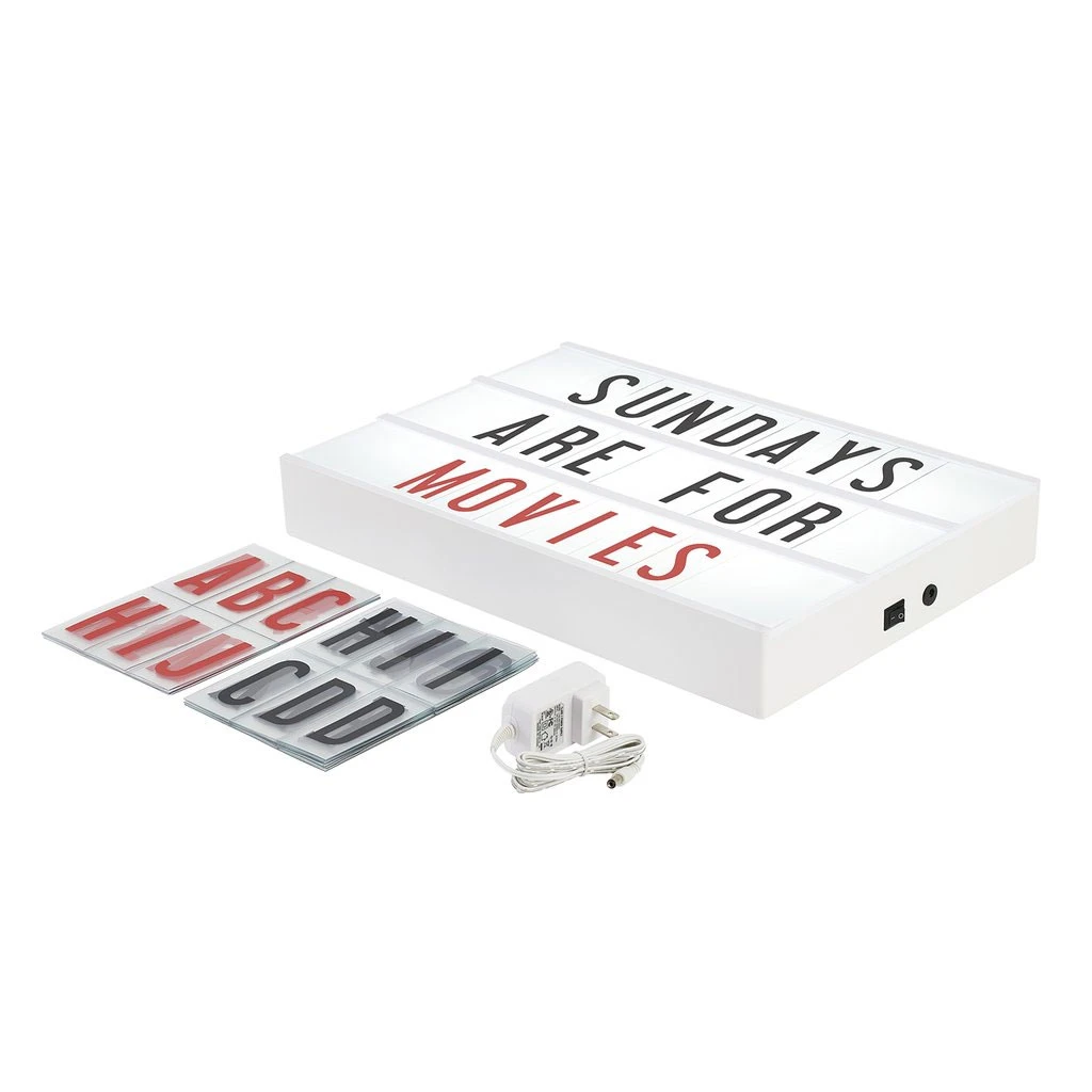 The XL Cinema Lightbox is finished in a White shell, includes a matching braided rope USB cable. Simply slide in letters to make your own sign. Perfect for home, wedding decor, milestone announcements, photoshoots, or just about anything. Powered by USB cable (included) or six AA batteries (not included). Table top or wall mountable. Lightweight, portable, fits 10 tiles across each row. Includes 100 black and red letters, numbers, character and symbol tiles. DC Adapter and extra tiles sold separately. Indoor use only.